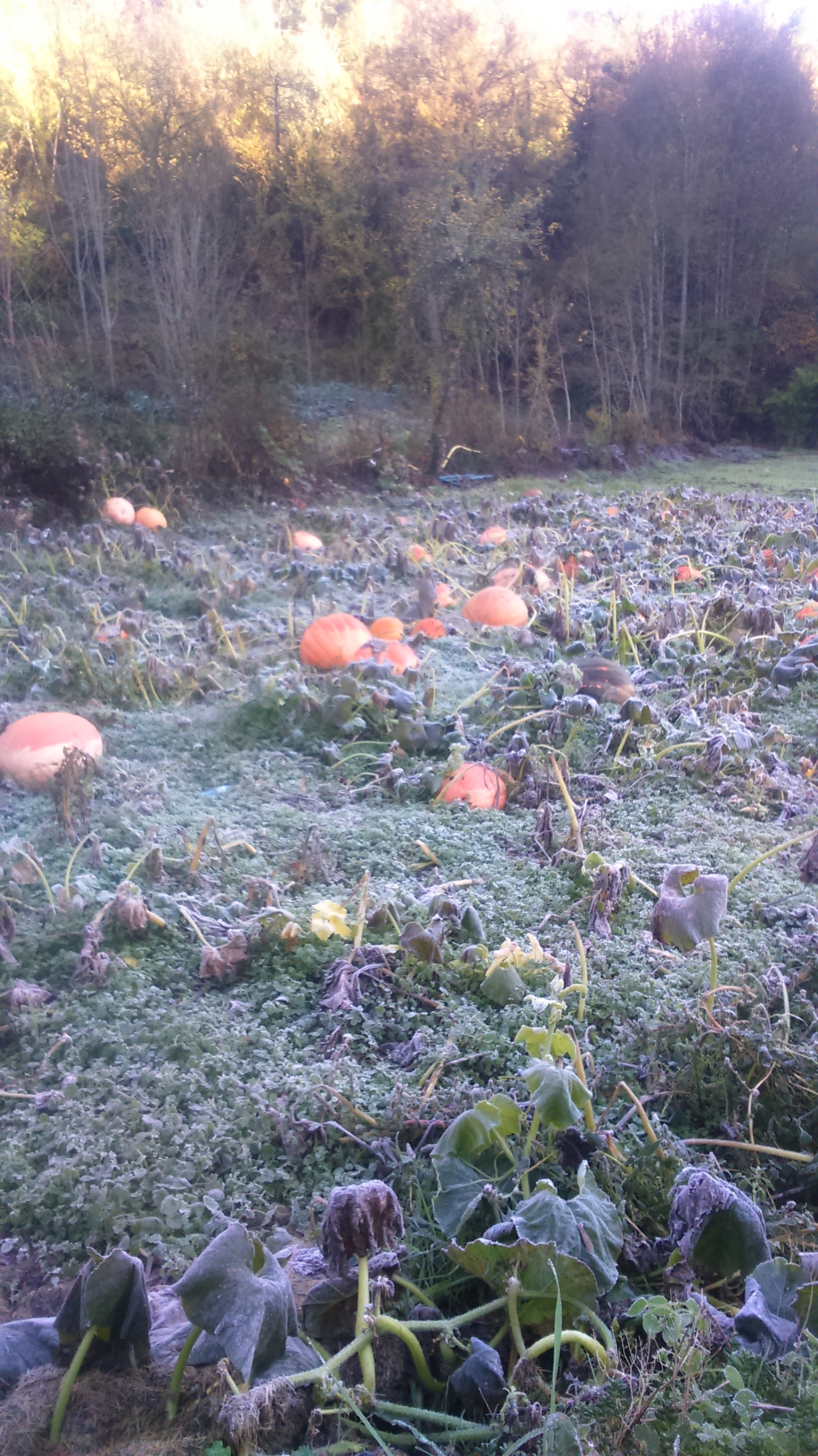 The harvest pumpkins were like great, gleaming gems in the frozen patch.