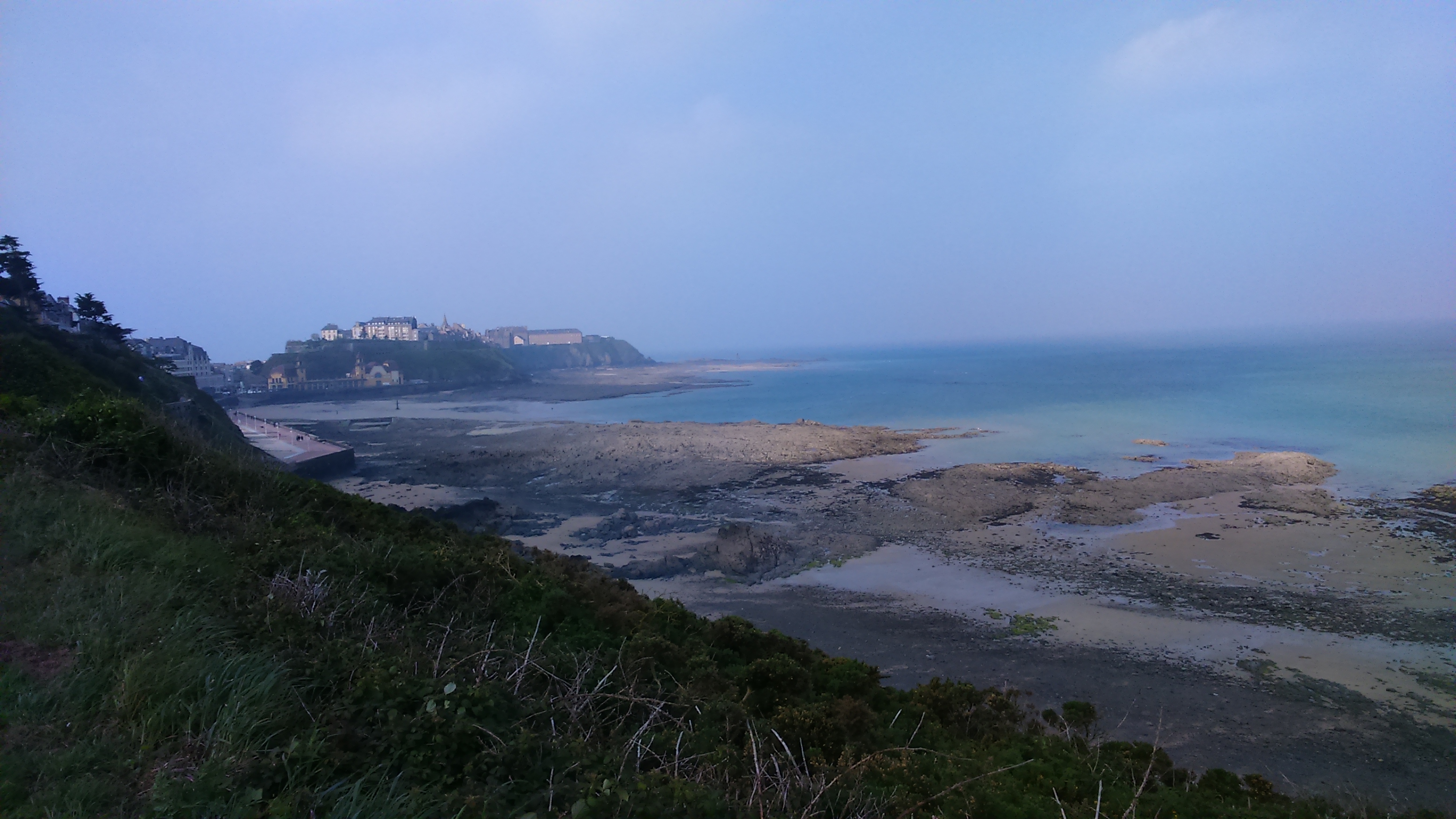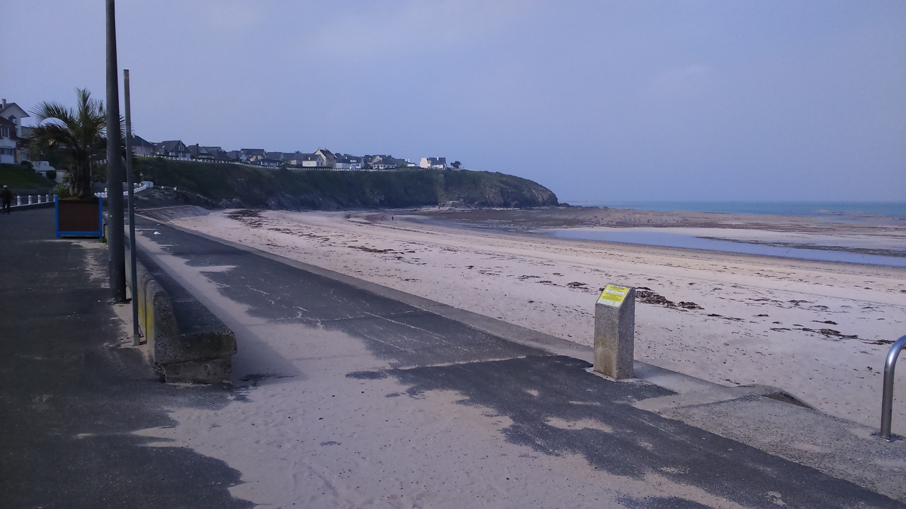 Grey pointed rooves and white walls are typical of the architecture along this part of the coast. There are huge rocks along the landward edge of the beach and I can already see Granville, a much bigger town, coming into sight. Hmm, hungry!