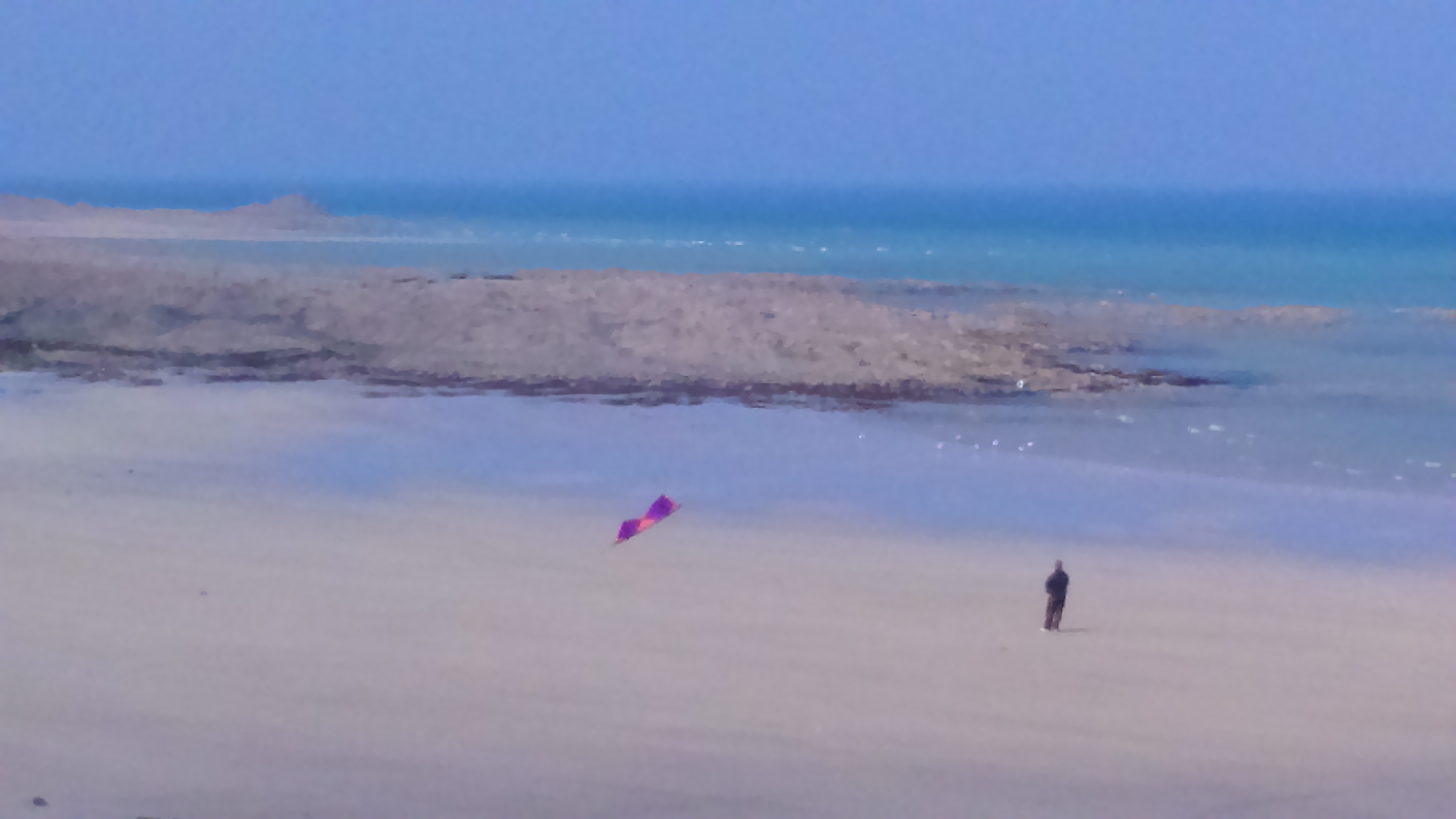 Kids are rock-pooling, there are colourful beach huts, and many people stop and ask about me and what I am up to, as I enter Granville. I regard a man taking advantage of the breeze, and flying a kite in figures of eight.