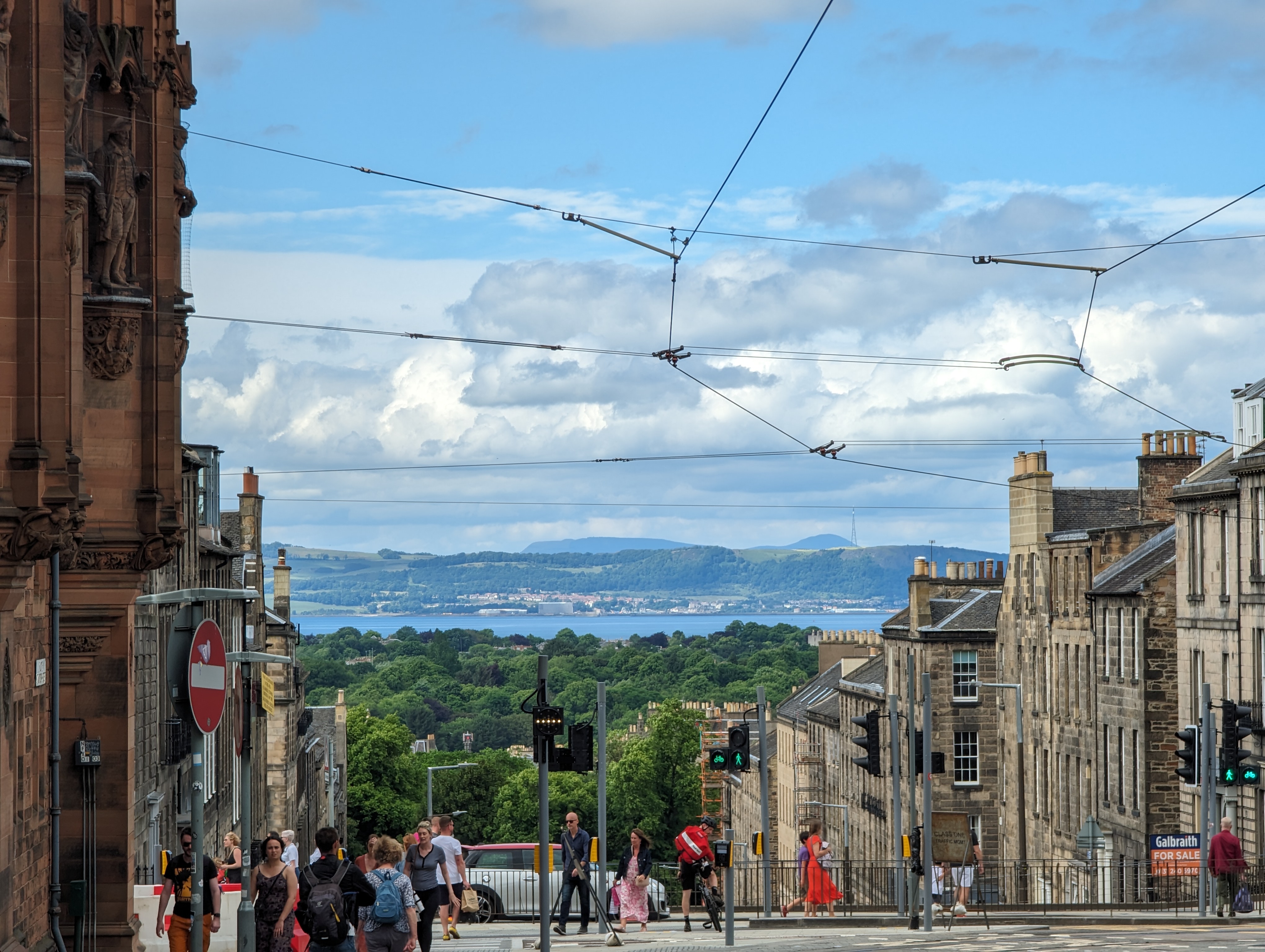 A series of narrow ‘closes’ on the left as you leave the Edinburgh castle, take you down steep steps to The Mound with the tower of New College (The University of Edinburgh) on the left here.View of Fife from Queens Street