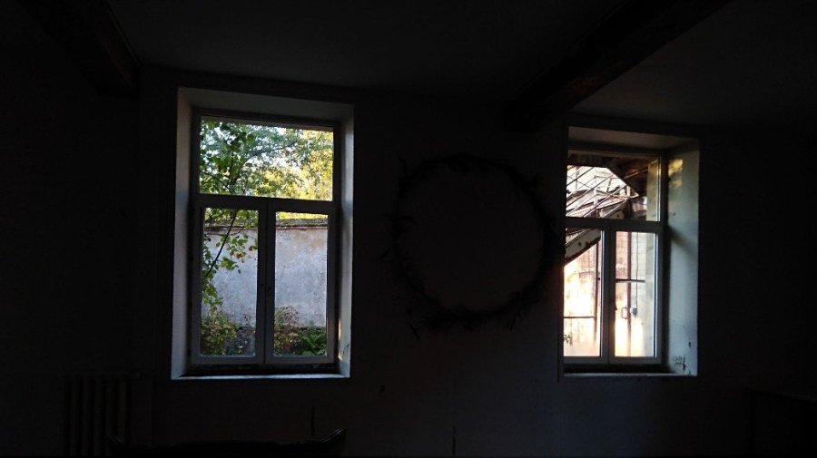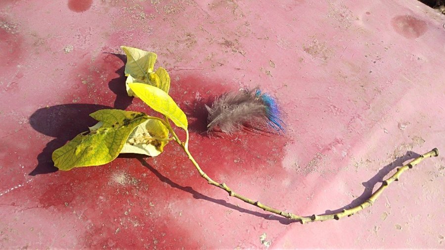 I look up as something thuds. An apple lies beside me. As I watch, whisper of a leaf; an acorn drops. Fruits still red and ripening.