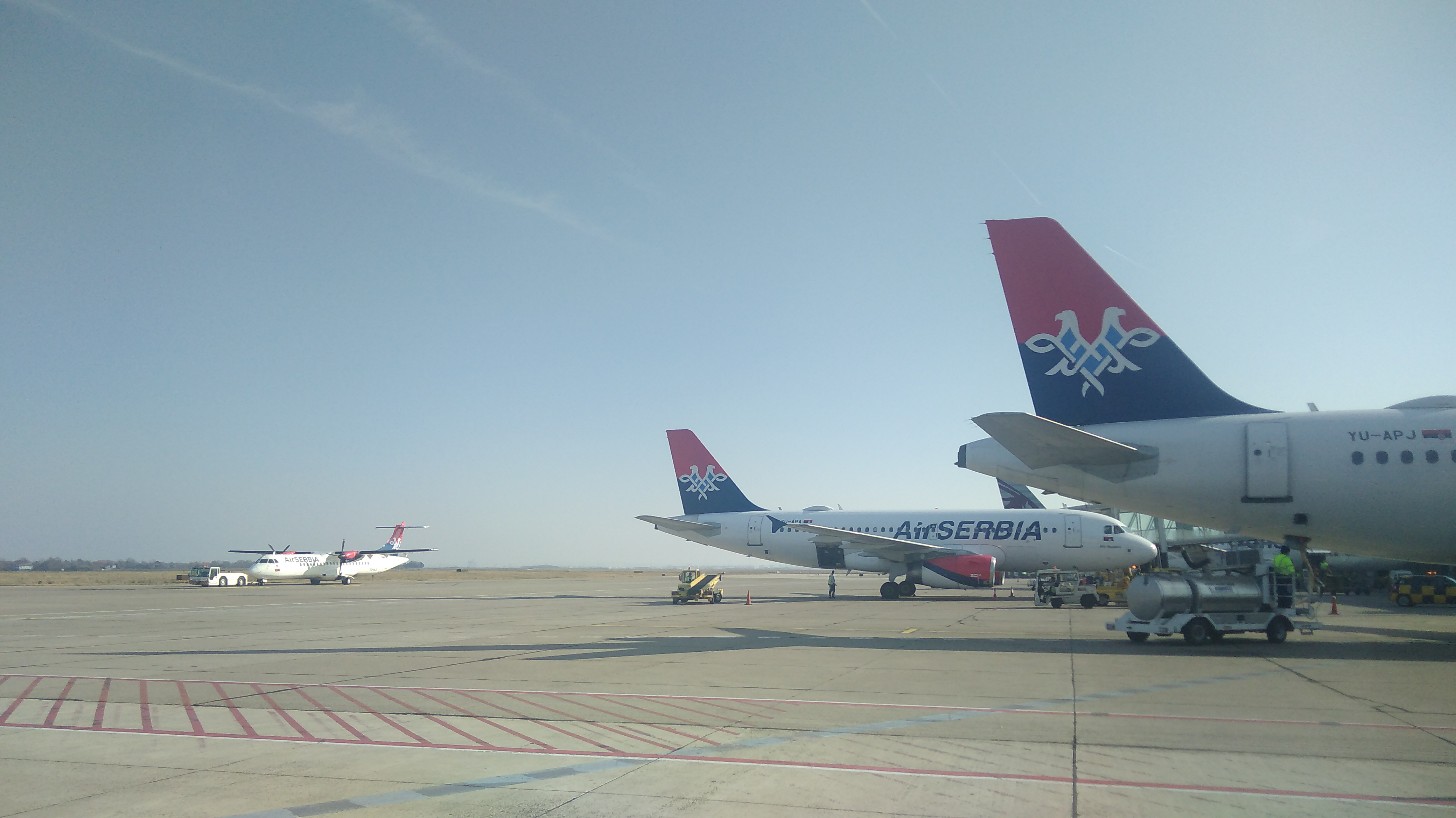 I recommend the cafe below at Belgrade Airport – helpful staff, free WiFi and delicious green tea. It takes euro and local currency.