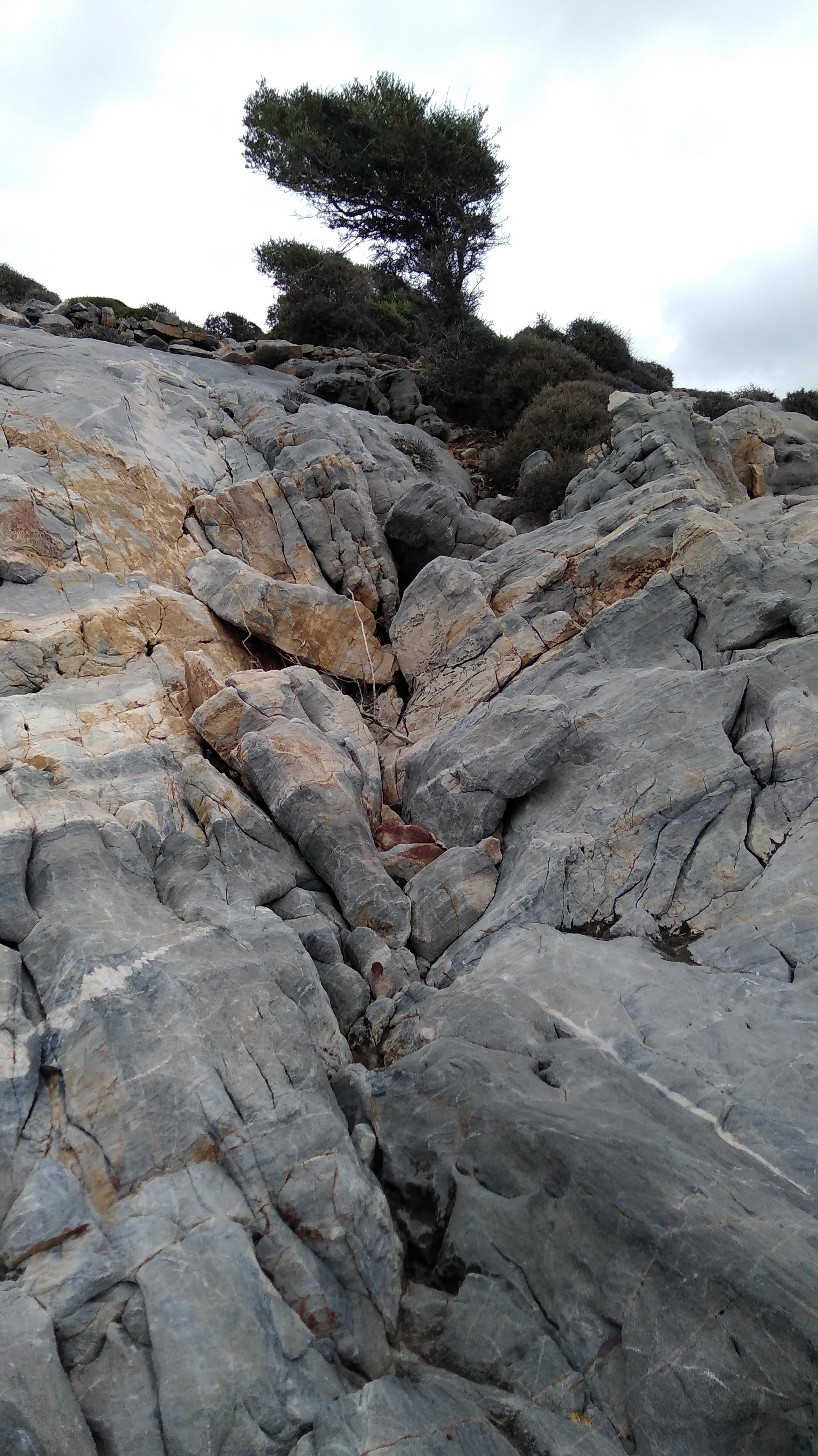 And wind blown trees atop crevices of grey and bronze stripes. East Macedonia and Thrace, Northern Greece.