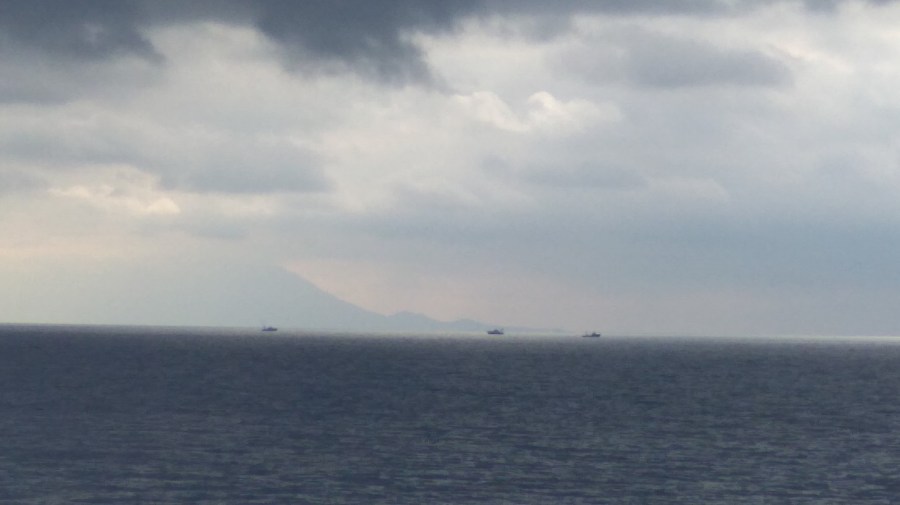 The island of Samothraki is visible along the length of this coastline. A 2.5 hour ferry trip away from Alexandrouplis, there are men-only monasteries and a fantastic walking route. Further down the coast towards Thessaloniki is the island of Thassos which is made of white marble, the same that was used to build the White House in Washington DC. Samosthraki almost lost in the mists, with fishing boats. East Macedonia and Thrace, Northern Greece.