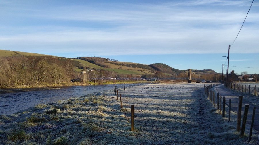 The impressive Chain Bridge, near Melrose, Scotland. Ice still on the ground at 11am.