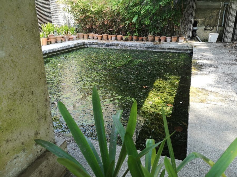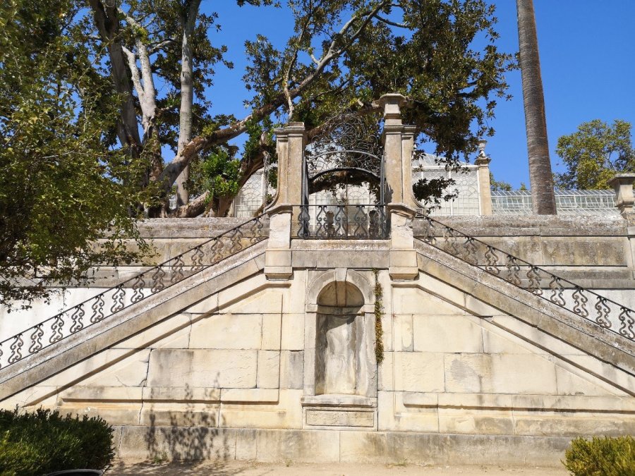 Peaceful pool glimpsed through fencing, Botanic Gardens. Coimbra, Portugal