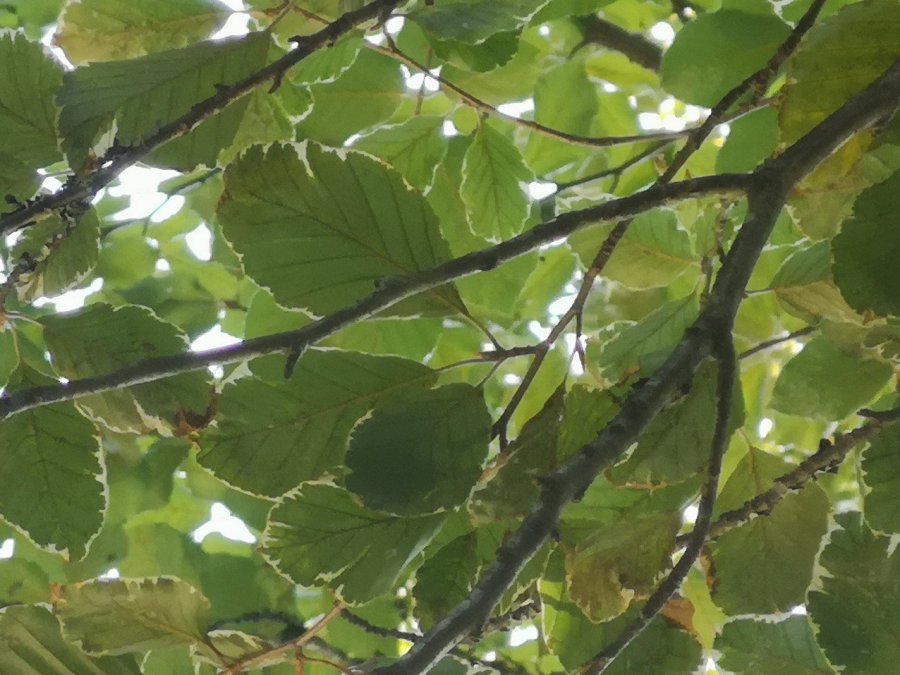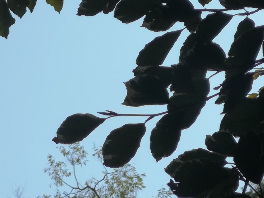 As the sun moved, different aspects were highlighted: some of the leaves had white outlines, the central veins were a strong brown as diagonals left it, tapering to almost-orange at the edges. When I woke from my reverie (I bit the inside of my mouth – ow) there was a green-bellied bird which had a linea negra down the middle and matching cap. The blacktipped wings were folded as it hopped around, just showing at the sides, from the underneath, in exactly the same way that the black lichen edged the branches. Nature is so clever!