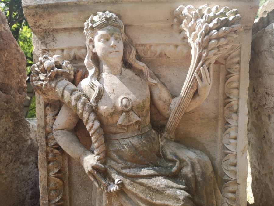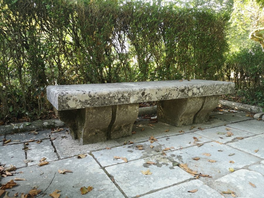 Carving on fallen masonry, Botanic Gardens, Coimbra, Portugal