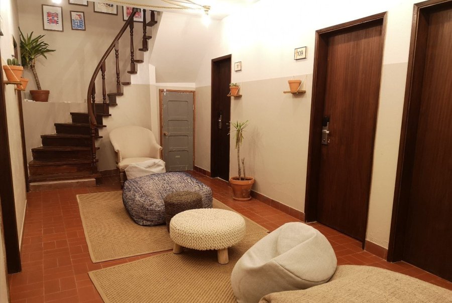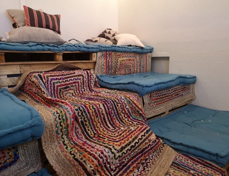 My day at the hostel began with yoga on the roof before sun up. I tiptoed past these comfy cushions to get my mat so as not to wake anyone. Later I flopped down onto the big squashy beige one for a rest on my way back down. Whew!