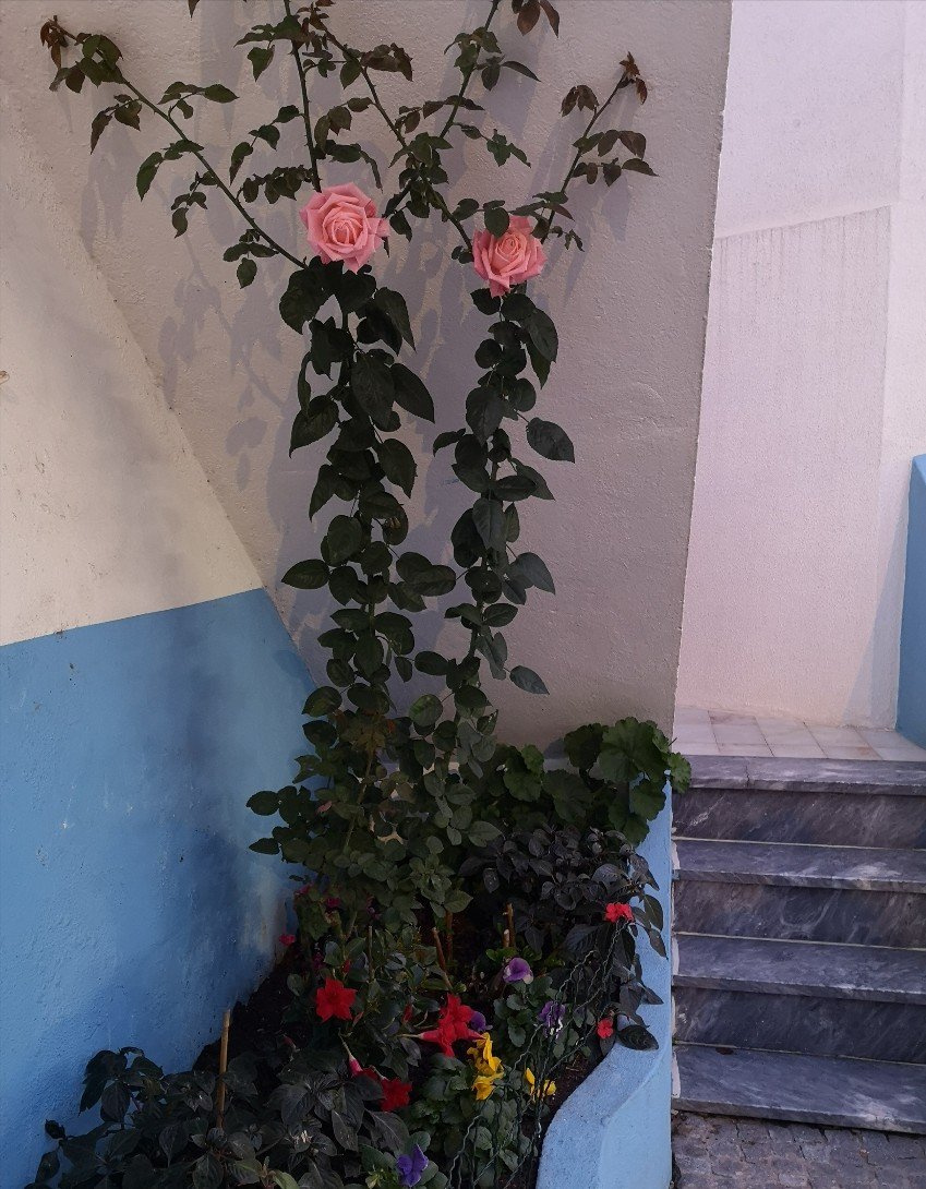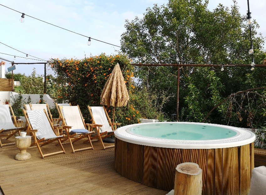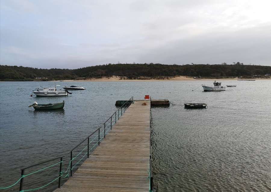View across the Mira River as it comes close to the Atlantic Ocean, Vila Nova de Milfontes, PortugalSteps make a beautiful place to sit if there are roses like these beside youAt the end of my walk I returned to the hostel for a jakuzzi and, afterwards, lay back on the deckchairs to relaxI enjoyed a drink at sunset on these designer seatsIn the evening, the cinema space at the hostel had these rugs and mats spread over the sitting area, giving it an Eastern look