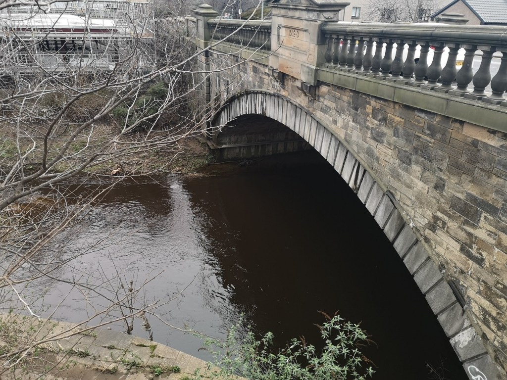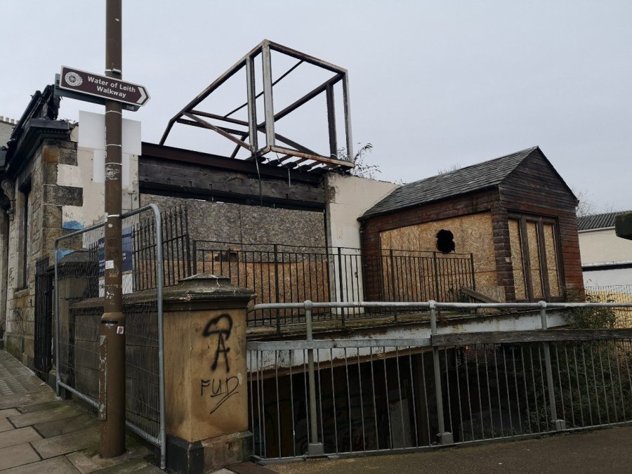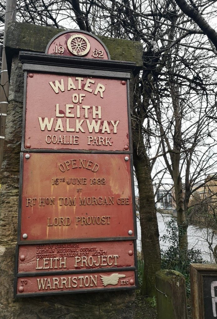 After leaving the Rosebank Cemetery, we cross Bonnington Road, a toll road at the end of the 18th century. We enter into what would have been Bonnytoun (pretty village in Scots), encompassing mills and land which was part of the Barony of Broughton (mentioned in a Royal Charter 1143). Flanking both sides of the road are modern estates as well as the much older red stone Burns Tenements (on the right), which used to be the tannery. We were also going to be seeing the graves of leather workers with their pincer tongs and other tools adorning them in the North Leith Burial Ground, further along the way. Using the power of the Water of Leith, there was a conglomeration of businesses in the Bonnytoun area, and there is one existing mill wheel in the mill lade at Bonnyhaugh Cottages (on the left).