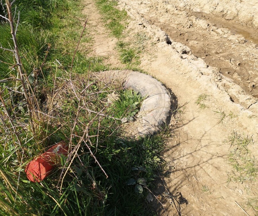 The path took me around a corner where some old equipment was half buried and put out to pasture. Wide open fields were flattish, a gentle rise in the distance and the wind from the north was chilly except when sheltered by the hedgerows.