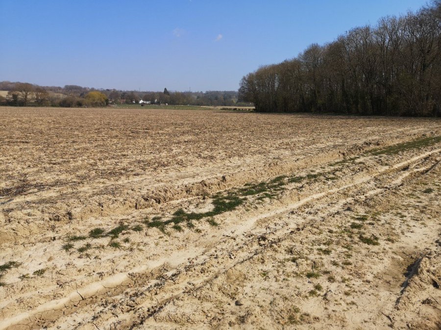 Through a metal gate, I went left onto a farm track of very dark loam, ploughed by machinery wheels and criss-crossed with tree shadows and sunshine-saturated grass. Steeply down now, until I unfortunately spied a Public Footpath stone and so took a right up a slight bank and out into the open again where there was one of the ‘footpaths’ I have walked the length of before in this area. This narrow enclosure drew me along and then, suddenly ending in a field, it showed me up to the right (where admittedly the vibrant green of ground-spreading chamomile was growing alongside left-over broad bean seedlings) and, without realising where I was heading, I was through another metal gate and onto Yalding Hill.