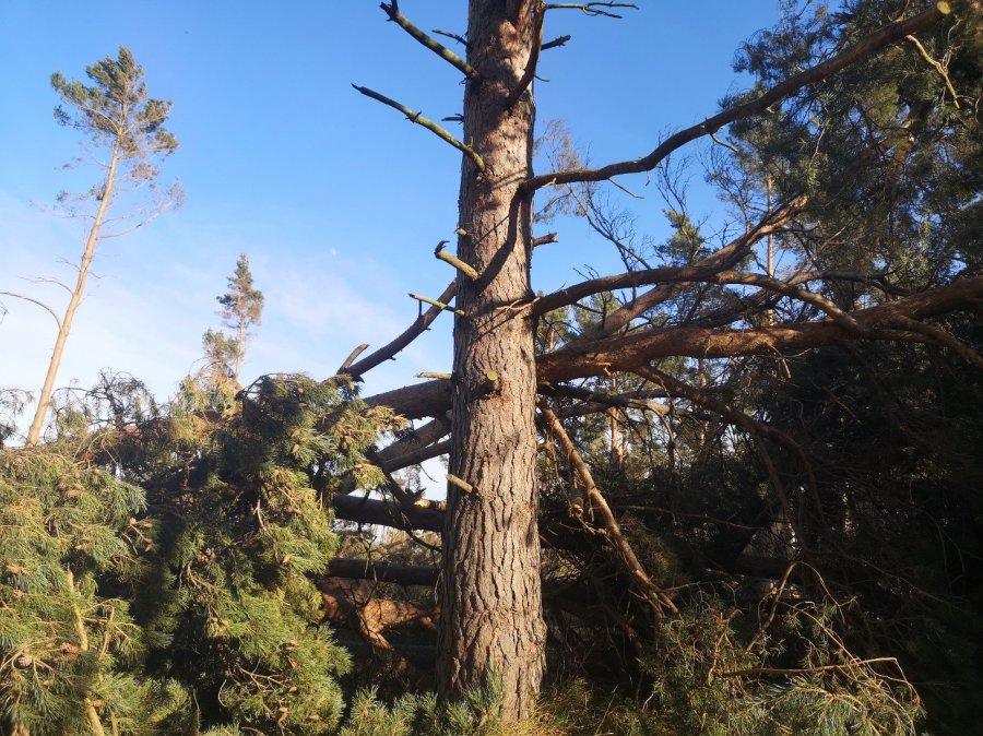 A broken Scots Pine during Storm Arwen, John Muir Country Park, Scotland