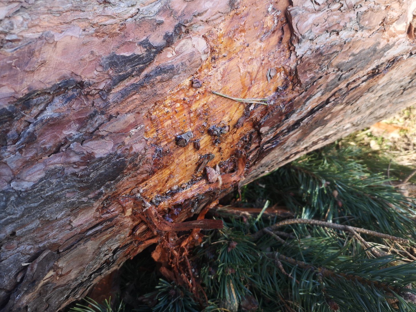 Fallen tree with sap oozing, John Muir Country Park, Scotland