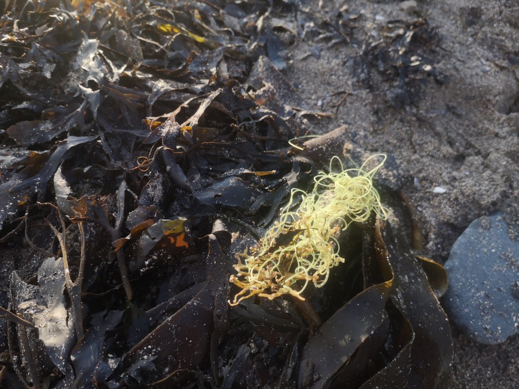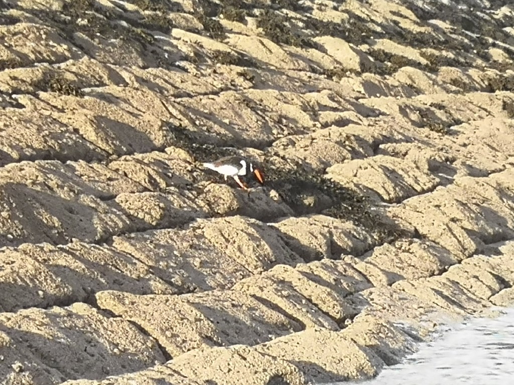 While we waited, I spent a considerable time removing this yellow fishing net which had become entangled with the seaweed on the beachStraightaway, we spotted a few oystercatchers foraging on the Eastern breakwater with their red-orange bills and distinctive Balenciaga colouring. Unfortunately my phone camera cannot take good photos at a distance