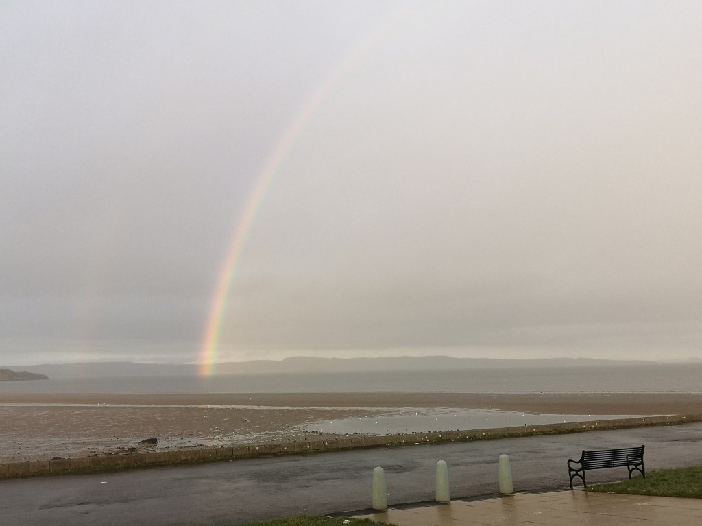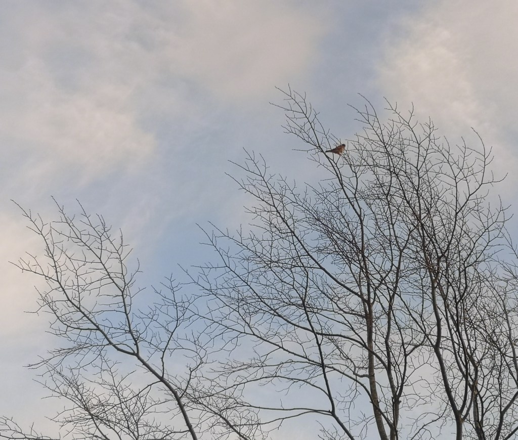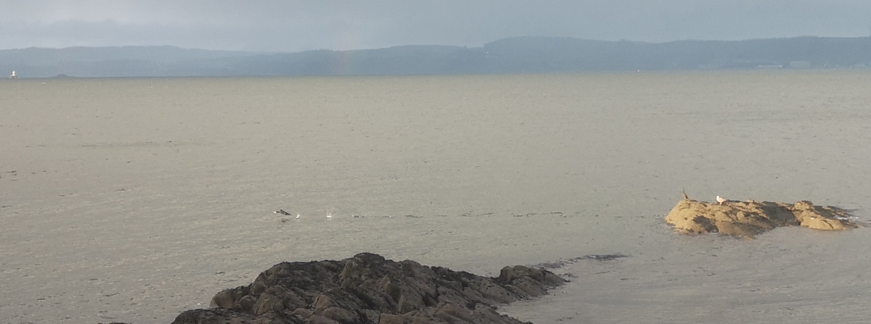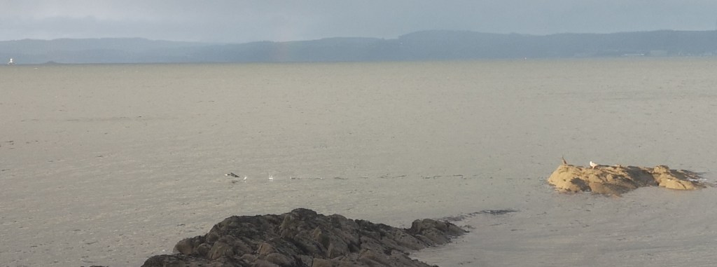 Another poor quality long-distance shot, but I managed to capture the cormorant skimming away from the rock it had been sunning onBy the time we reached hot chocolate heaven with cold hands and full bladders, the rain was coming on and we admired the rainbow beside Cramond IslandAs we walked inland, we spotted a kestral hovering with wings spread, listening to something it had spotted, plummeting, and then sitting in a tree nearby, perhaps digestingLauriston Farm have recently fenced off their lower field so that migrators can overwinter there safely – commendable work that will benefit us all. Jennifer, Ewan and Kim, trusty fellow walkers