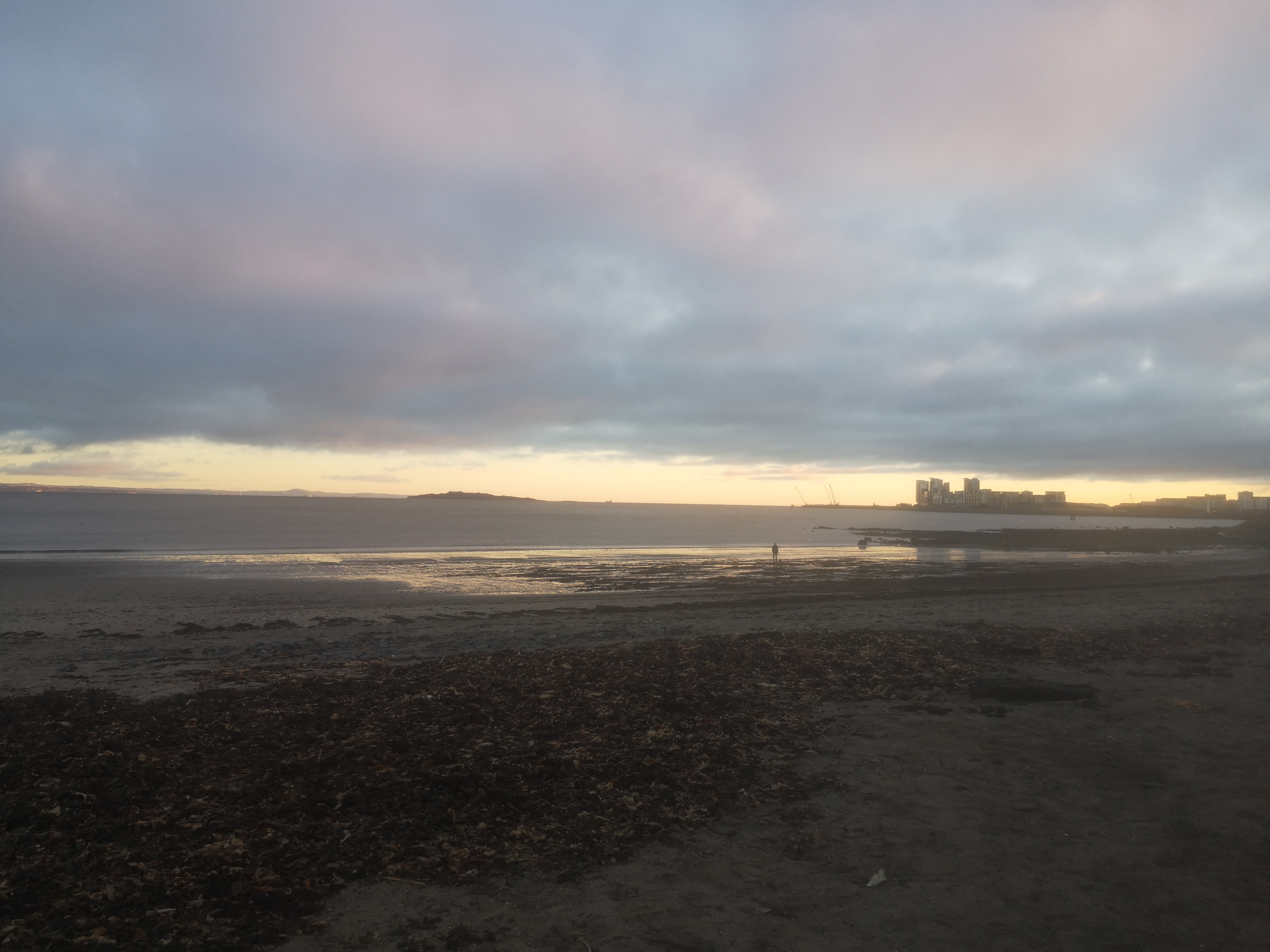Anyway, I chose to walk the same route every day. Starting at the view near my front door 15 minutes before, walking to the highest point of Granton Crescent Park for sunrise, then down and through The Wasteland (to check whether my banner was still there and if the bulbs that we planted on the community walk had come up), and along to Wardie Bay for 15 minutes after. I didn’t make it on time to the beach every day as I got distracted by yellow cones at low tide and all manner of other things.