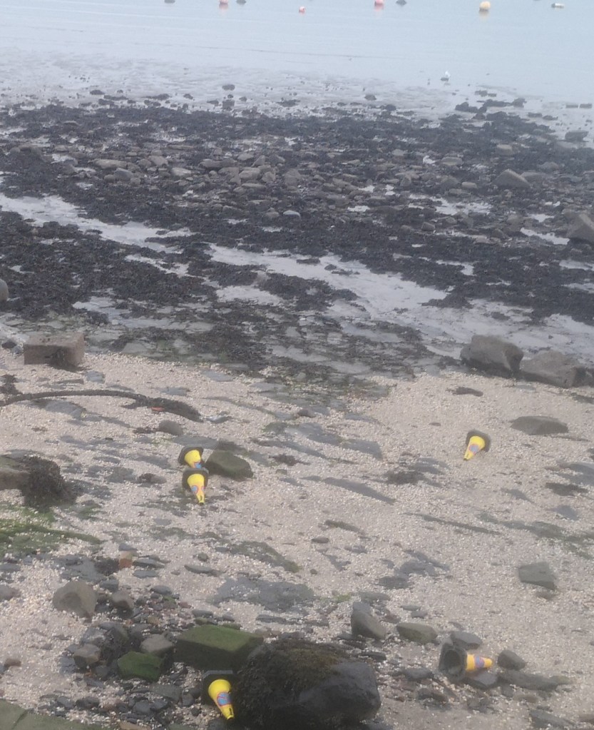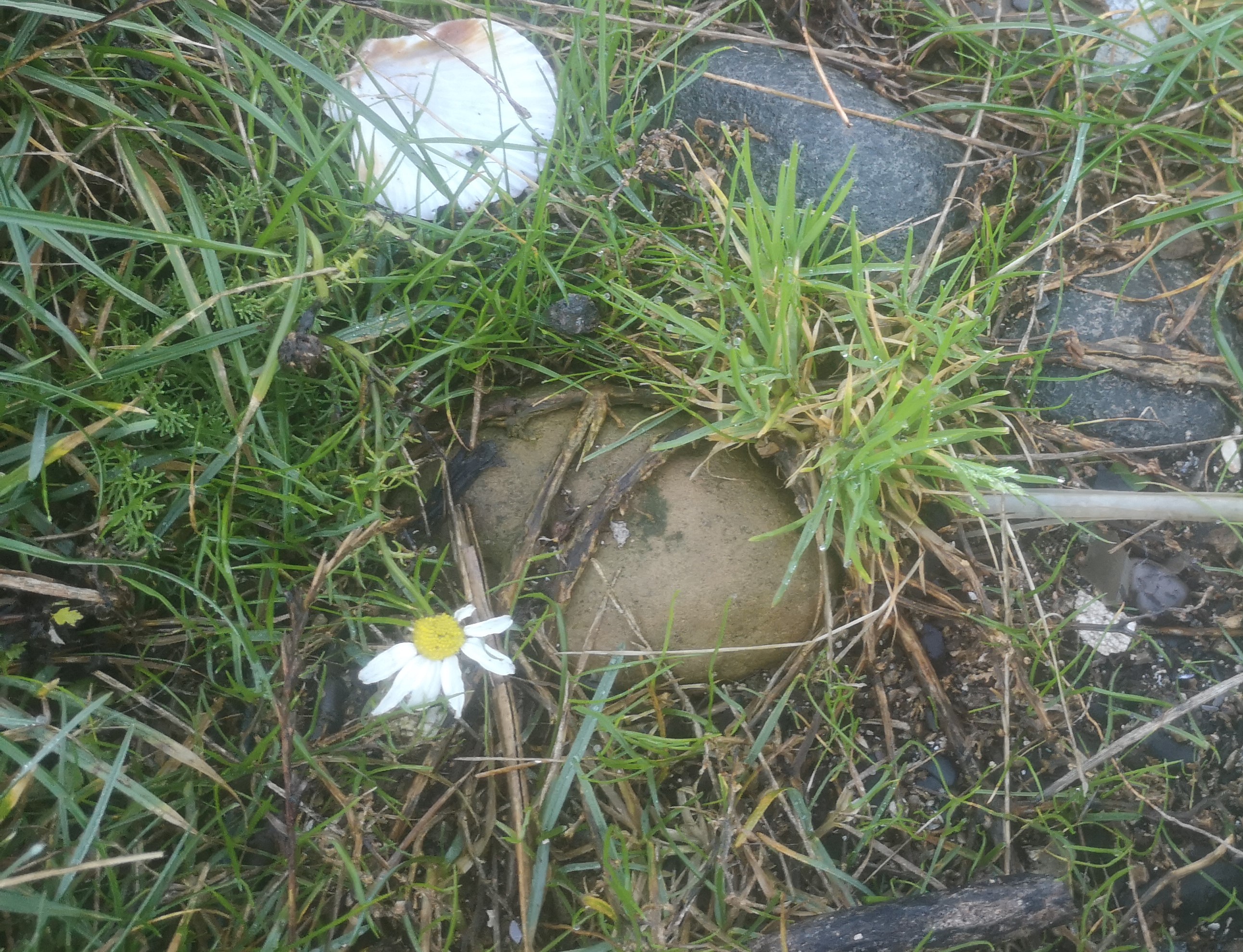 Traffic cones at low tide (left). That must have been a fine game for someone – really? They matched all sorts of other yellows which presented themselves: a sherbet-yellow yacht in the harbour, wild ragwort, chamomile (middle, like fried eggs with frayed edges), and spears of ageing sea buckthorn leaves (right). A flock of pigeons wheeled silently overhead, a single oyster catcher peeped piercingly, and a young gull lifted his feet higher than usual, one by one, to clear the wet grass fronds.