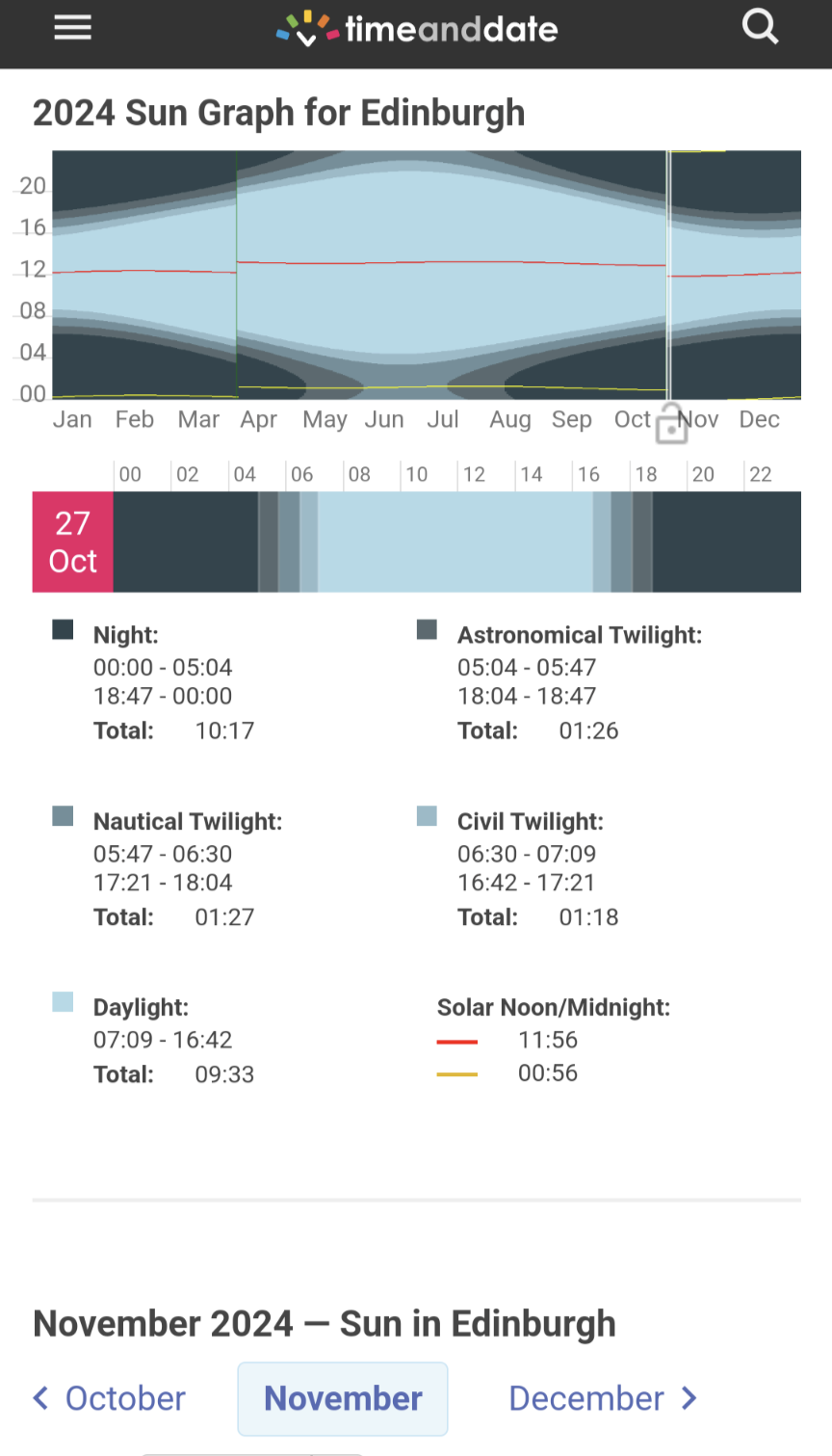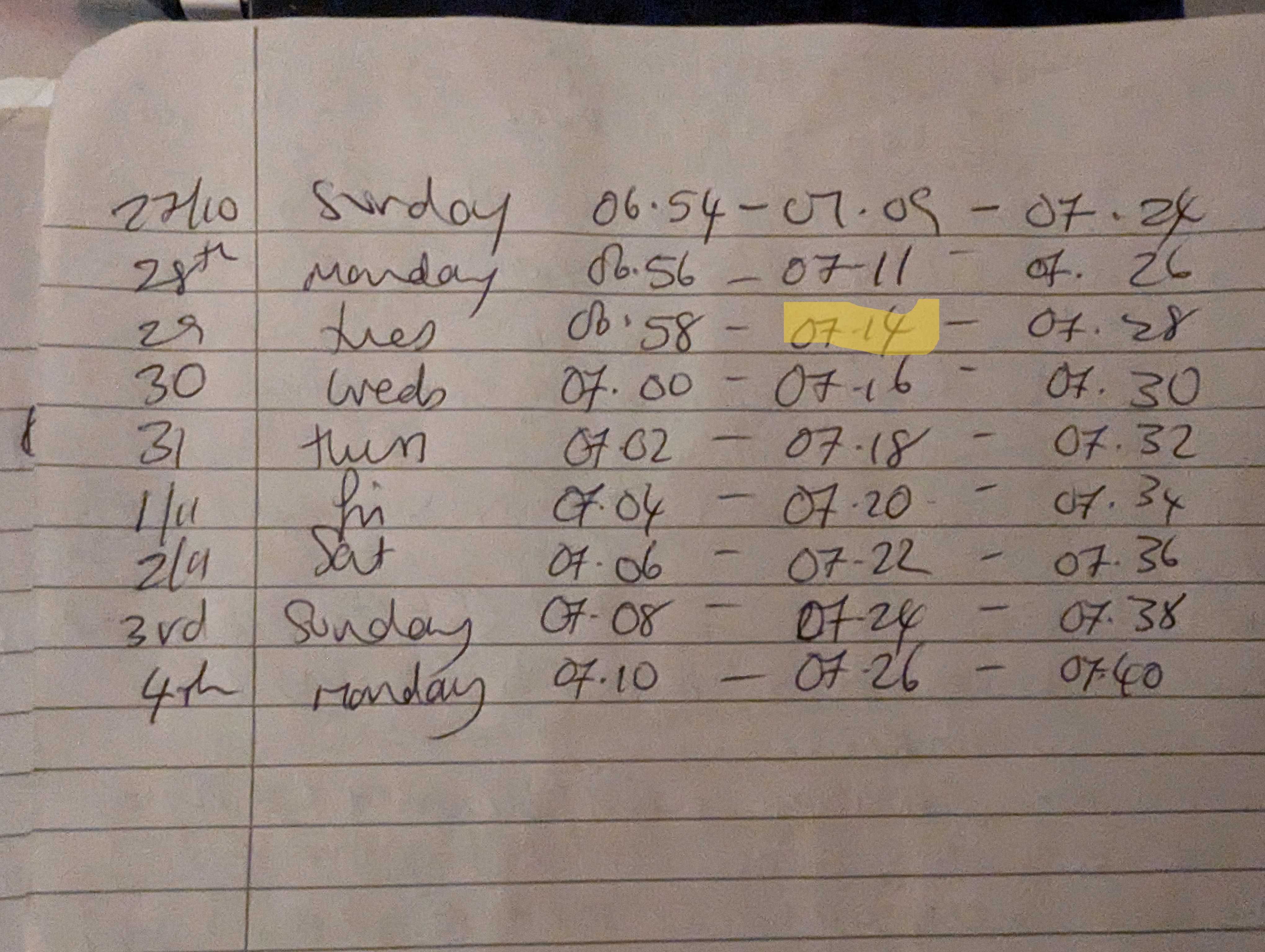 I took the sunrise times from the Time and Date website and missed the 3 minute difference between 28th and 29th October. Instead, I saw that there were 2 minutes between 27th and 28th, 30th and 31st etc and followed that pattern for all of the start and end times (I’d be no good in a lab or at setting train timetables) meaning that from day 3, I was snapping my photos at the wrong times.