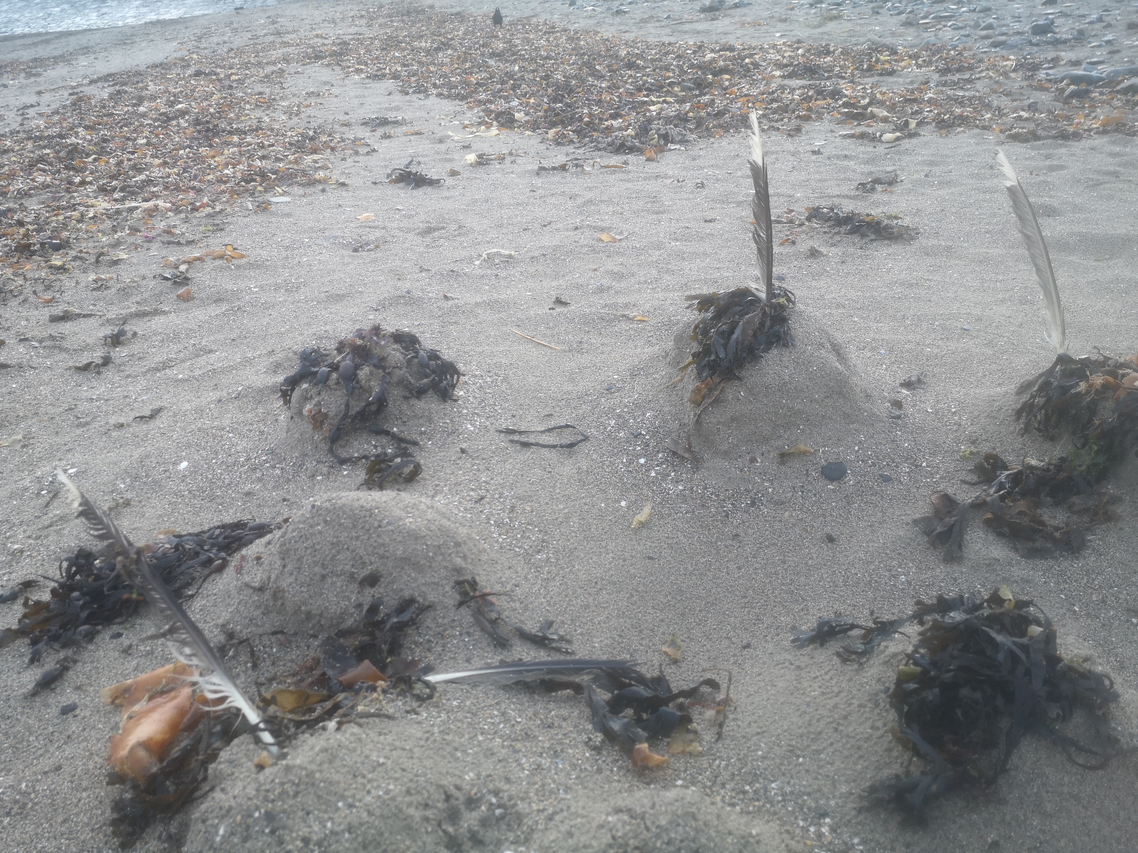 A long, thin black feather and a small slim, silver-blue fish, both on the strand – a grounded agent of flight and a beached swimmer. A series of sandcastles with upright feathers stuck in them like sentinels of the dawn. Border lines: Fife and Inchkeith Island on the horizon; the Eastern breakwater dissecting the sea, along which silouettes walked; the dividing line between the light and dark skin on my arm where the nettle stung me and left a tingling sensation for the remainder of the day. Fallen white poplar leaves and a camp in the little woods with silver tinsel looped over a branch.