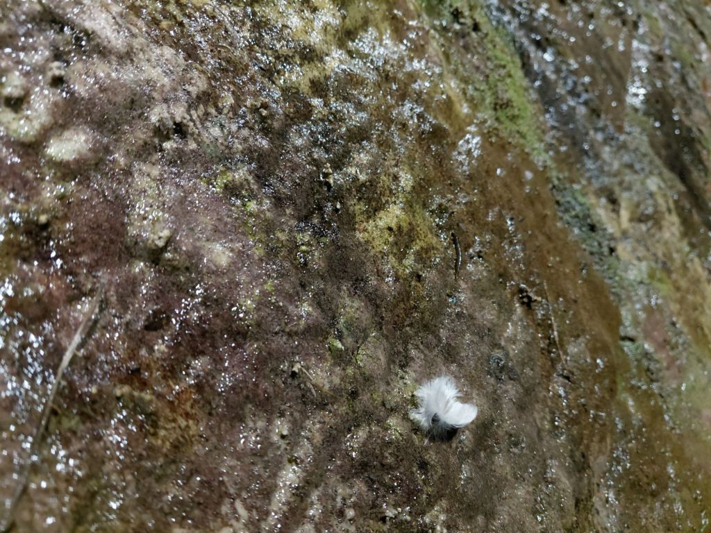 It’s a wet and mucky job as the rain comes in and runs down the walls, bringing with it all sorts of minerals and deposits in a wonderful array of subtle and extreme colours. The there are the mosses and lichen, spiders and flies, and lots of tiny feathers embedded there too.