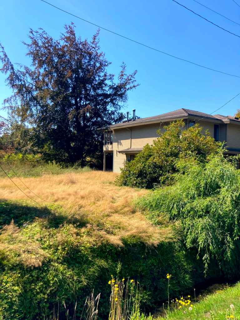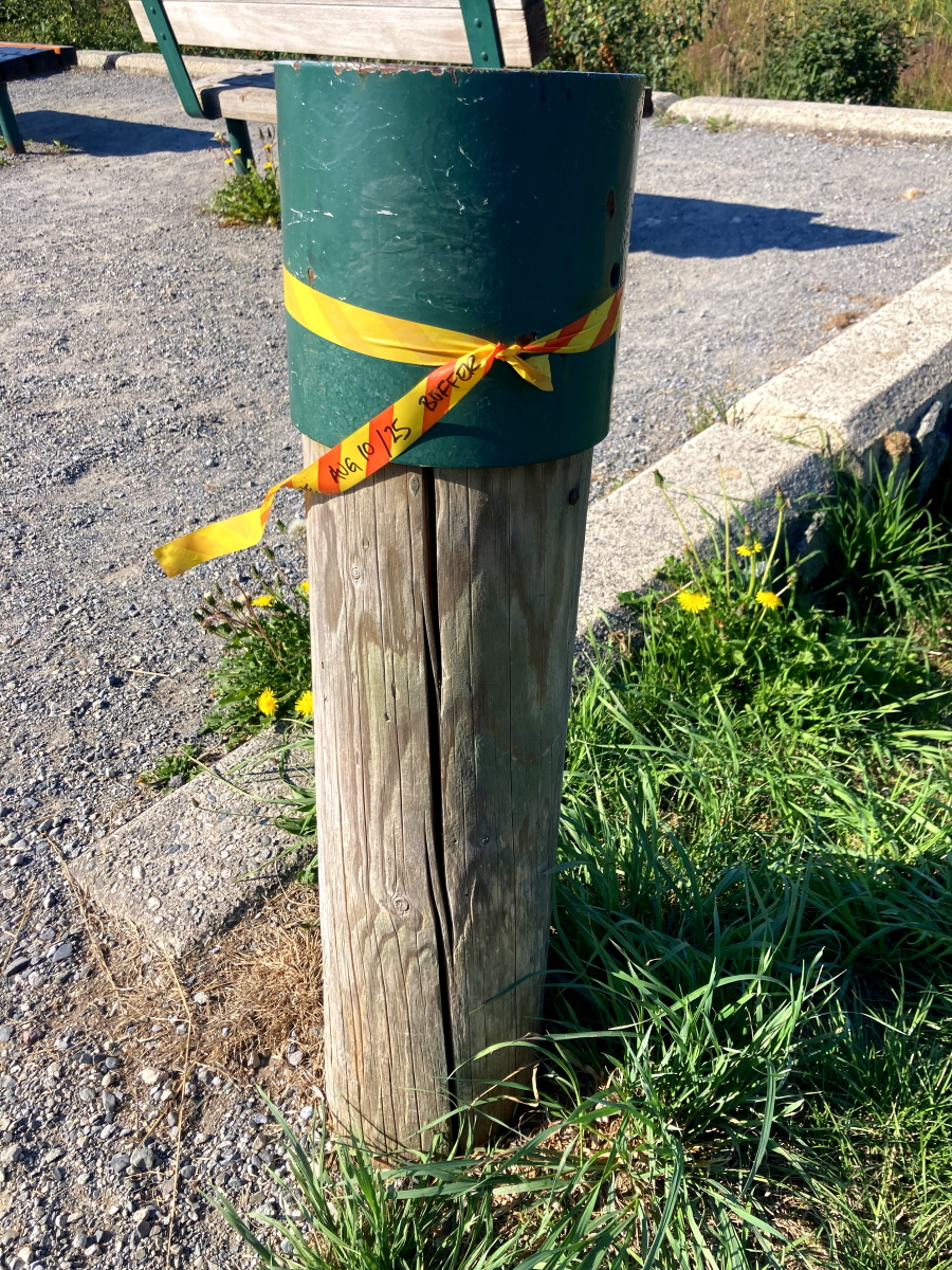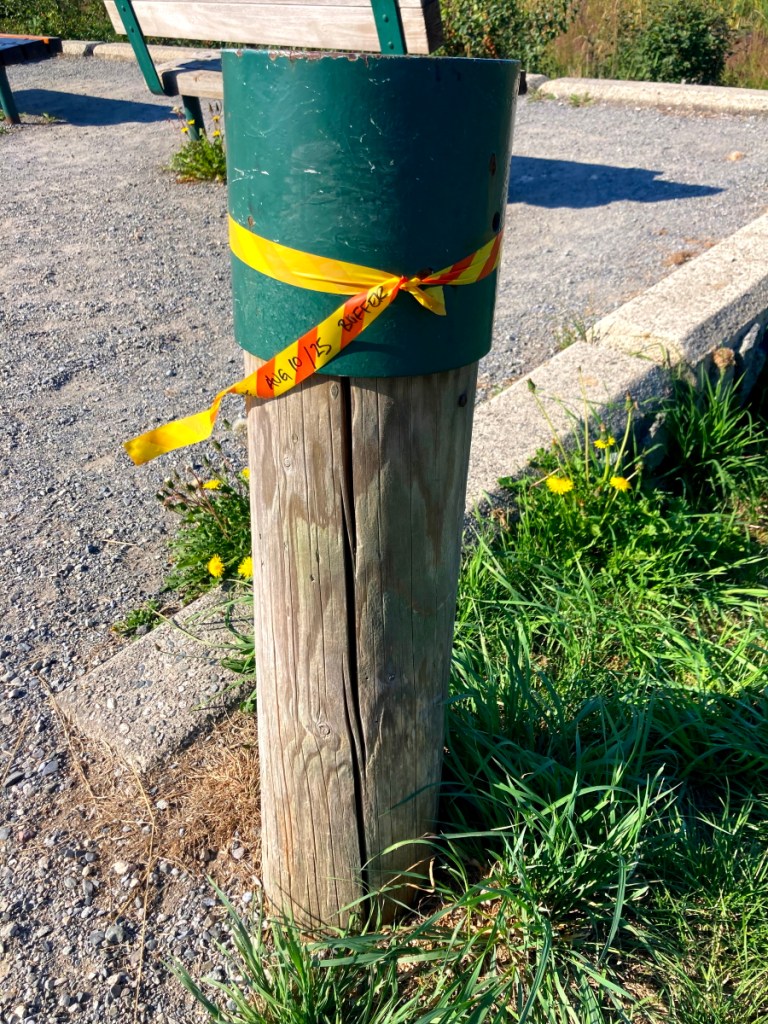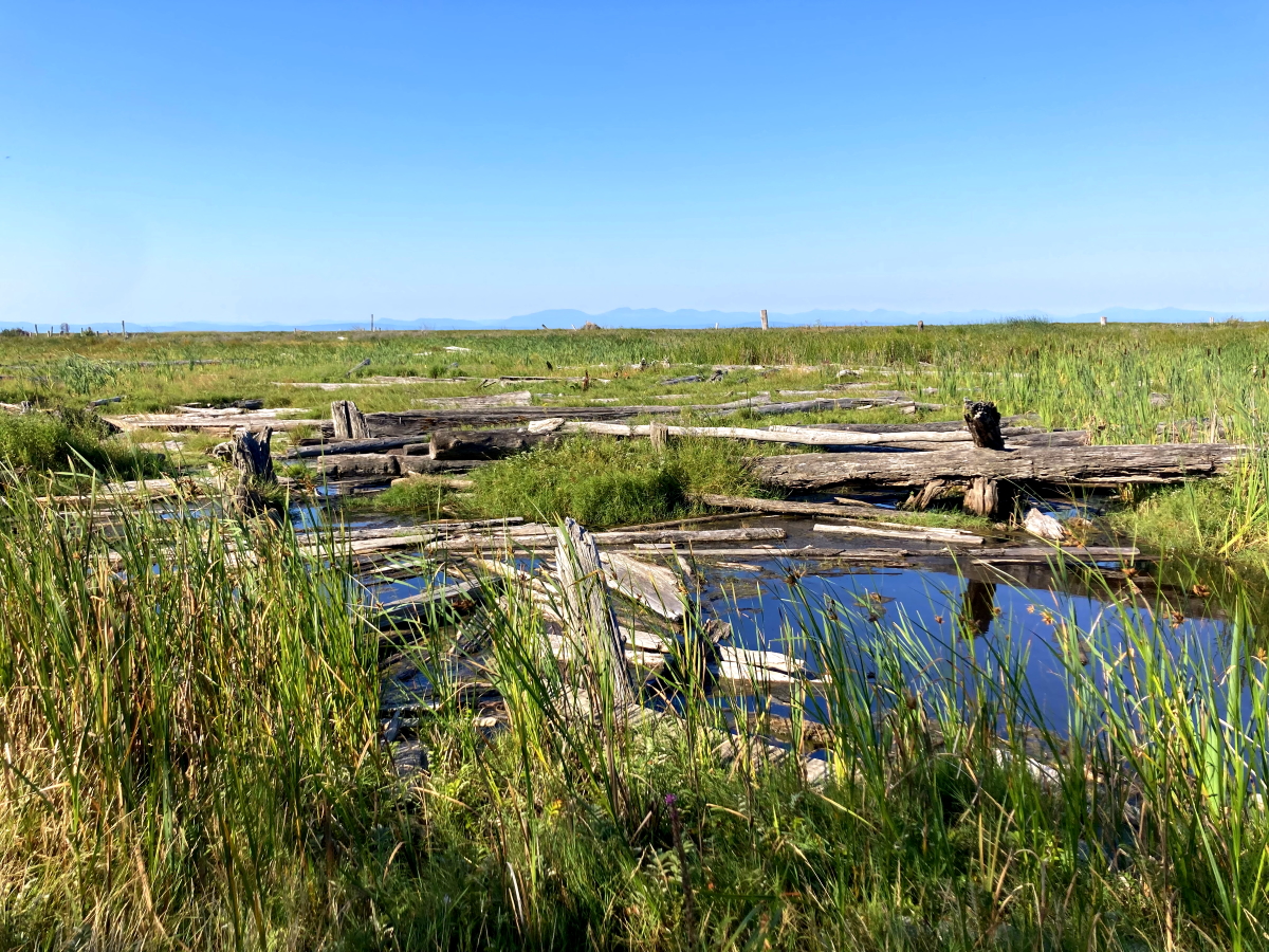 Kristina writes: I began my walk at a parking area (///swimmer.behaving.sailor) where the middle fork of the Fraser River meets the Straight of Georgia (Pacific Ocean). I followed a multi-use trail along the dike. When possible, I took unofficial trails that skirted closer to the intertidal flats area, passing through some thickets to where the ground becomes watery. My first intervention happened there. Leaving the path felt right. My second intervention was on the gravel dike path, where a long row of tall trees lines a golf course. My third intervention occurred where a residential road dead-ends at the trail, with a rural park on the other side.