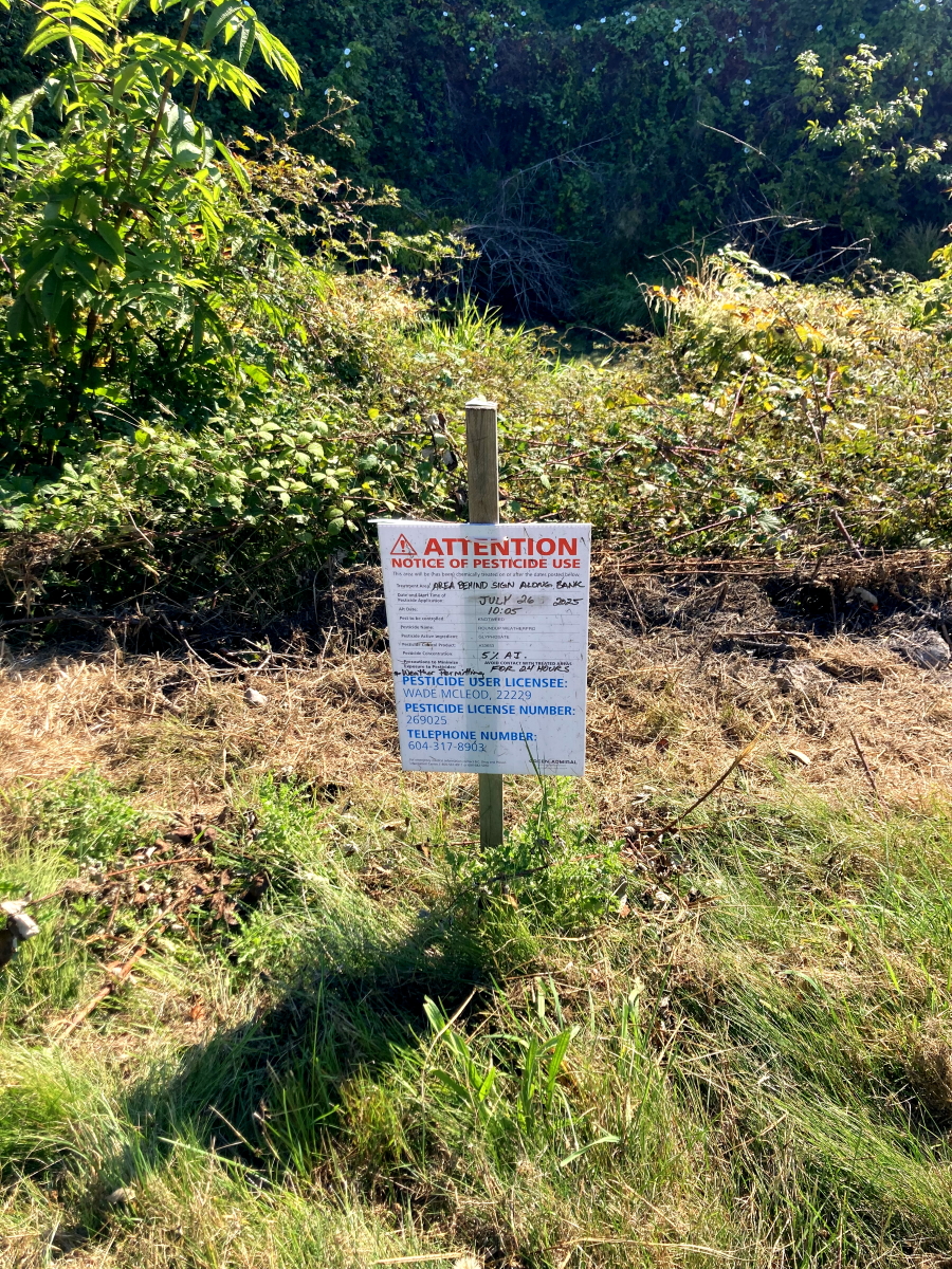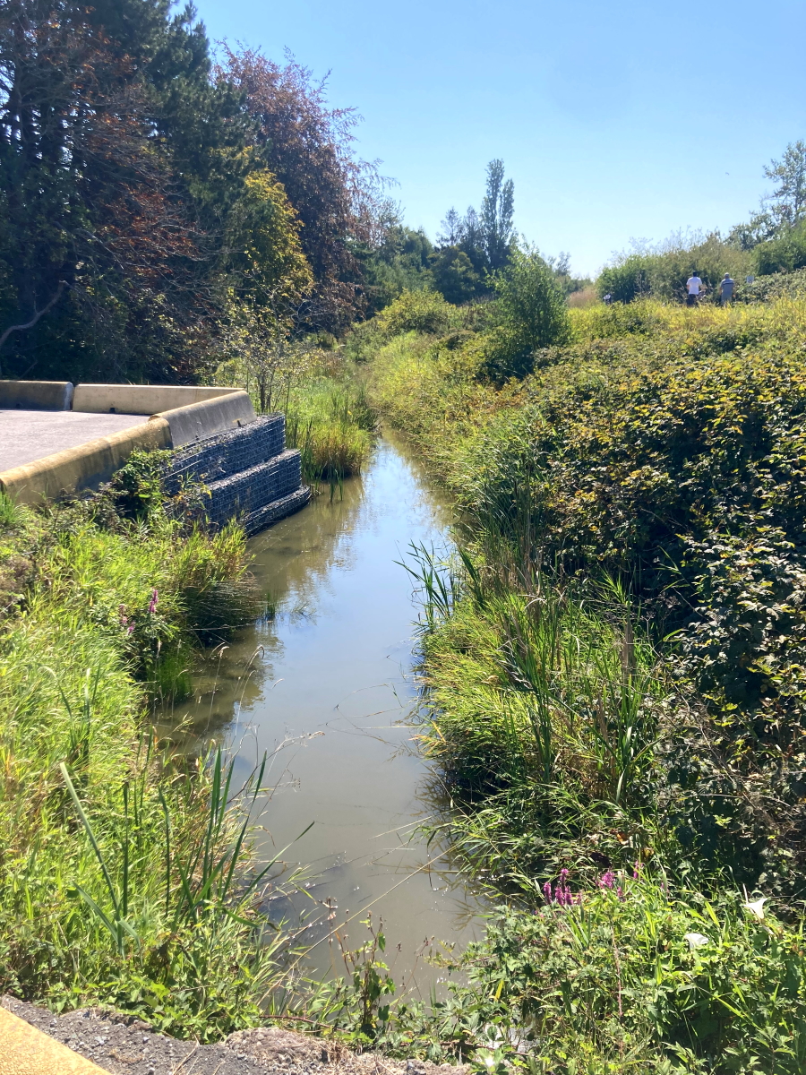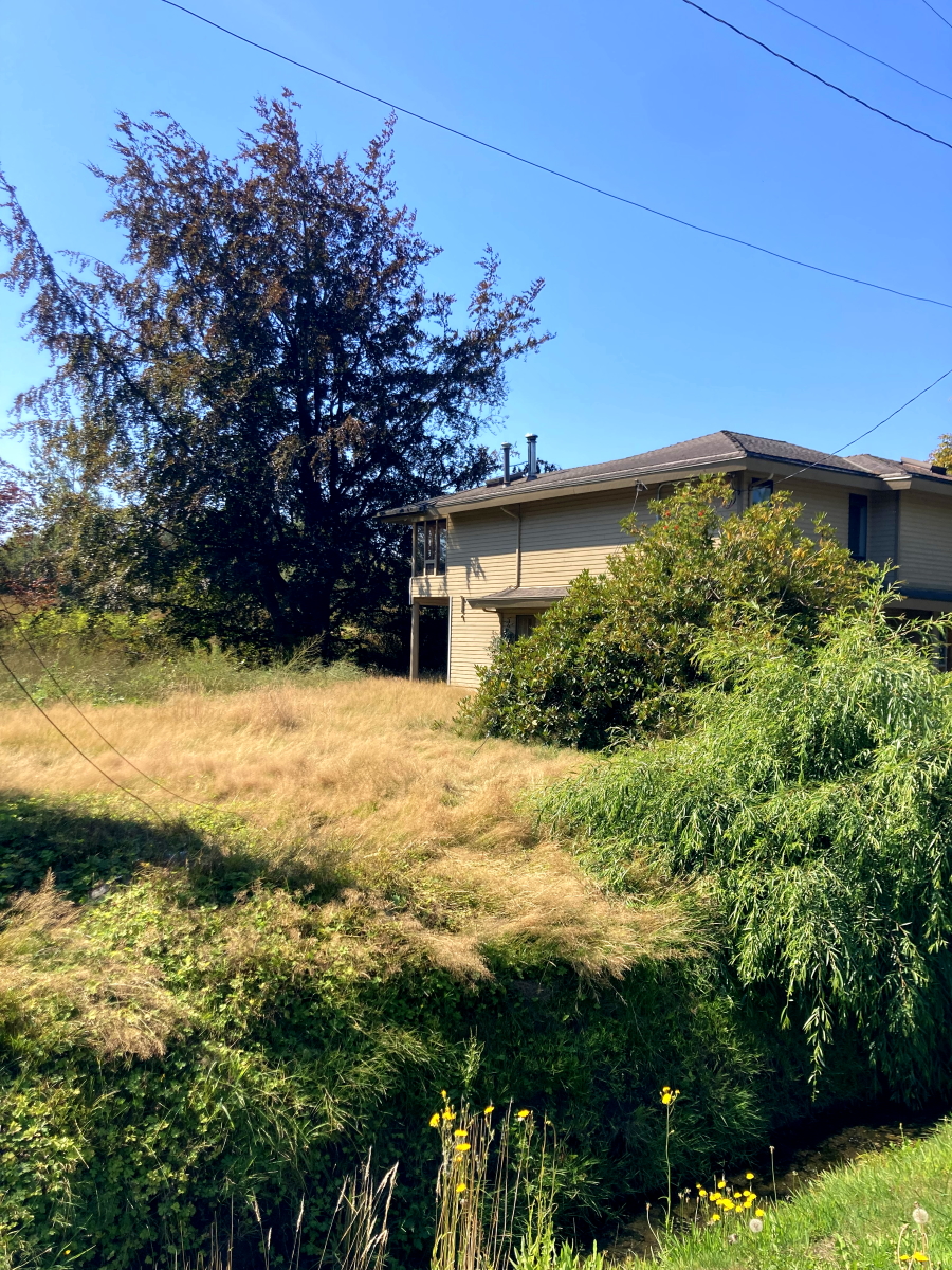 Kristina writes: I began my walk at a parking area (///swimmer.behaving.sailor) where the middle fork of the Fraser River meets the Straight of Georgia (Pacific Ocean). I followed a multi-use trail along the dike. When possible, I took unofficial trails that skirted closer to the intertidal flats area, passing through some thickets to where the ground becomes watery. My first intervention happened there. Leaving the path felt right. My second intervention was on the gravel dike path, where a long row of tall trees lines a golf course. My third intervention occurred where a residential road dead-ends at the trail, with a rural park on the other side.