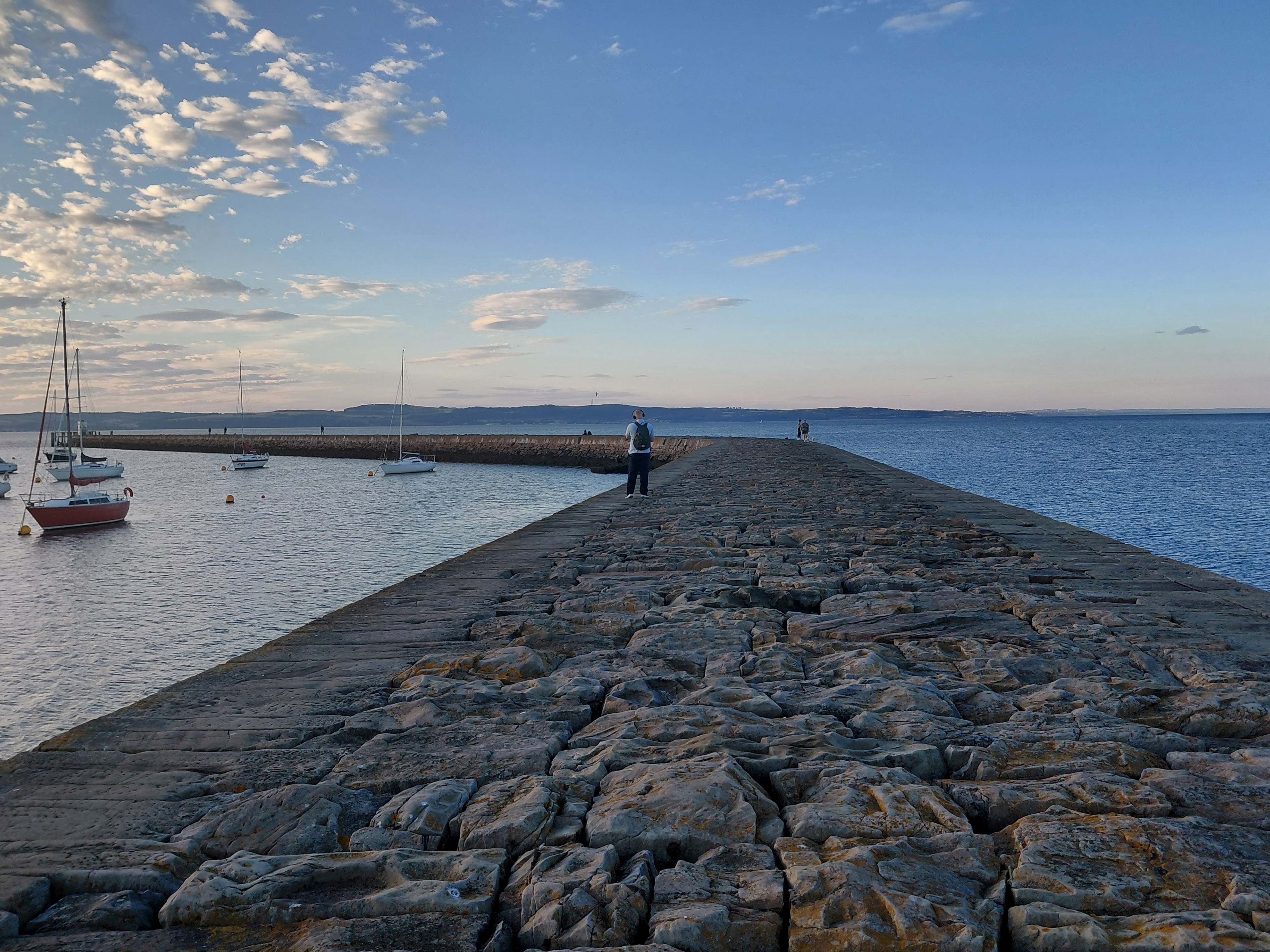 TG: I’m familiar with this walk, can actually see through the window if I stand on the edge of my bed. The Breakwater cuts a clean line into the sea, dissecting the outer limit of the city and points a crooked finger towards the far shore of Fife. Before the harbour was completed, in 1863, the shore showed on the maps as a smooth curve. Now, I like to think that we reach out and gather people into our arms (as the nation of Scotland welcomes refugees and people seeking asylum), extending our limits and, hopefully, opening our minds beyond borders.
