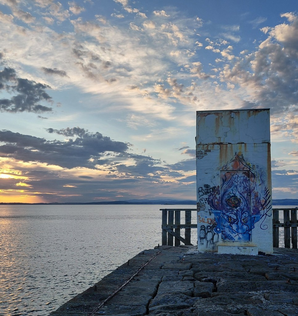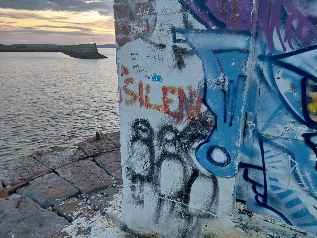 Tamsin writes: I began my walk at the intersection between land and the Firth of Forth (///kinks.coats.salsa), an estuary of the North Sea at the edge of the city of Edinburgh. I followed the Eastern Breakwater, the right arm of Granton Harbour. This long, stone wall (would you call it a dike?) is raised above the sea and divides the calmer waters where the yachts are moored, from Wardie Bay which is used for wild swimming. The Breakwater travels directly out to sea and then bends left, eventually coming to an end where the ocean surrounded me on three sides. A graffiti-covered structure stands sentinel. ‘Silence’ I read to myself. I looked down to the skirt of stones which appear at low tide around the base of the wall and saw a fisherman casting his rod. If he was aware of me speaking into my microphone to Kristina, he didn’t show it.