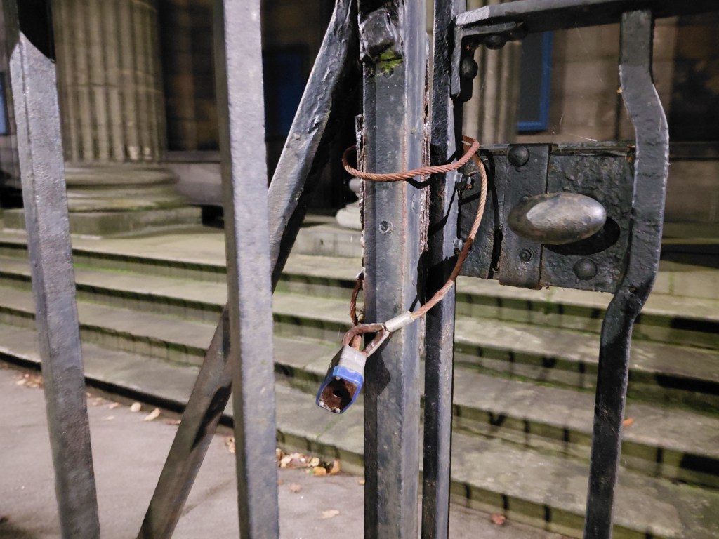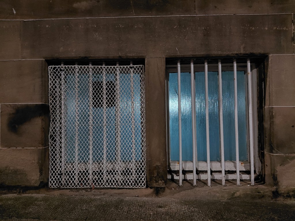 What route to take? On leaving the flat where I was staying, I soon came across North Leith Church, and though its grounds enticed me, lit as they were by an eerie light, I was unable to explore them because of a series of padlocks and ties. The plaque informed, Built 1818 by William Burn replacing the old St Ninian’s Church on Quayside Street. I’ll go to where it used to be then, I declared to the evening, and set off.