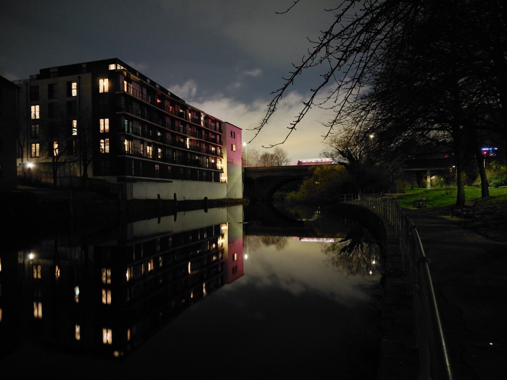 T: I joined the towpath at Coalie Park, a familiar location in the daylight, but not at night. It is not so much a park as a walkway beside the Water of Leith with municipal planting and wild greenery.