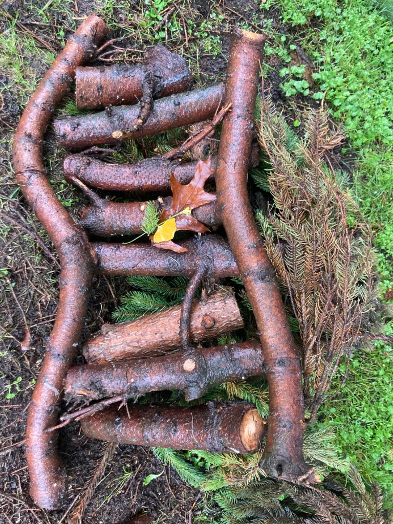 K: I sent my arrow photo to Tamsin, and when I saw the one she sent to me, I returned to the site of my earlier wood sculpture where I thought I might make an assemblage of my own. Instead I found the fallen leaves from a ginkgo tree, which reminded me of the colours in her piece, as well as pine boughs and some dandelion type flowers, which also echoed colours she used. I gathered a bunch of these, took them to the arrow and augmented the piece I had made.