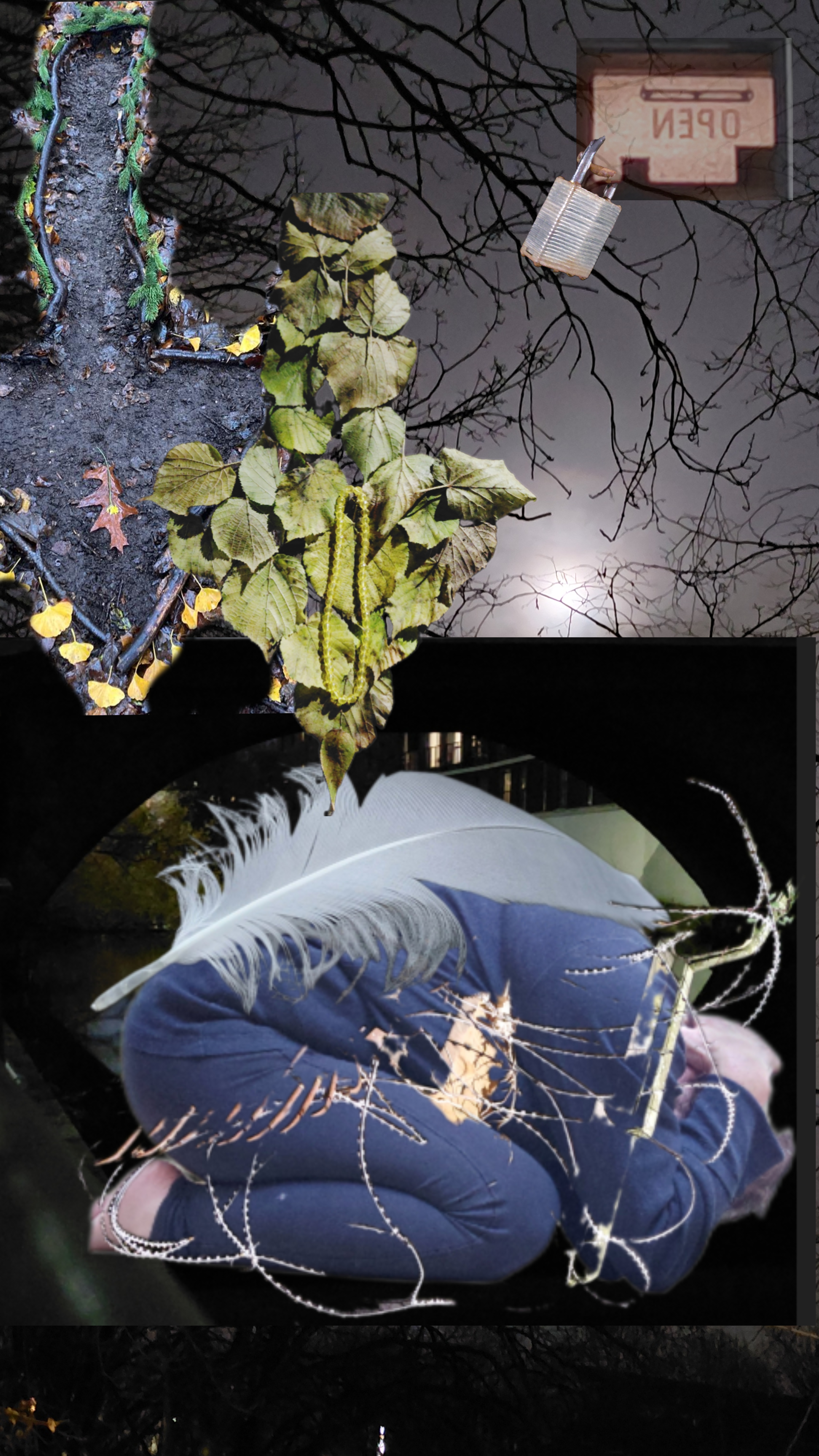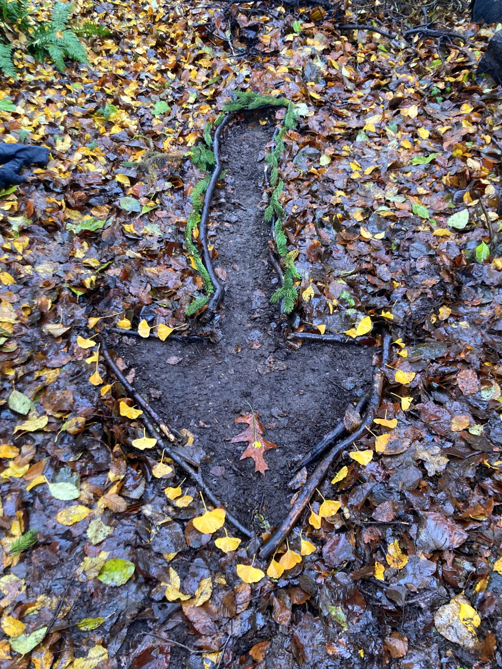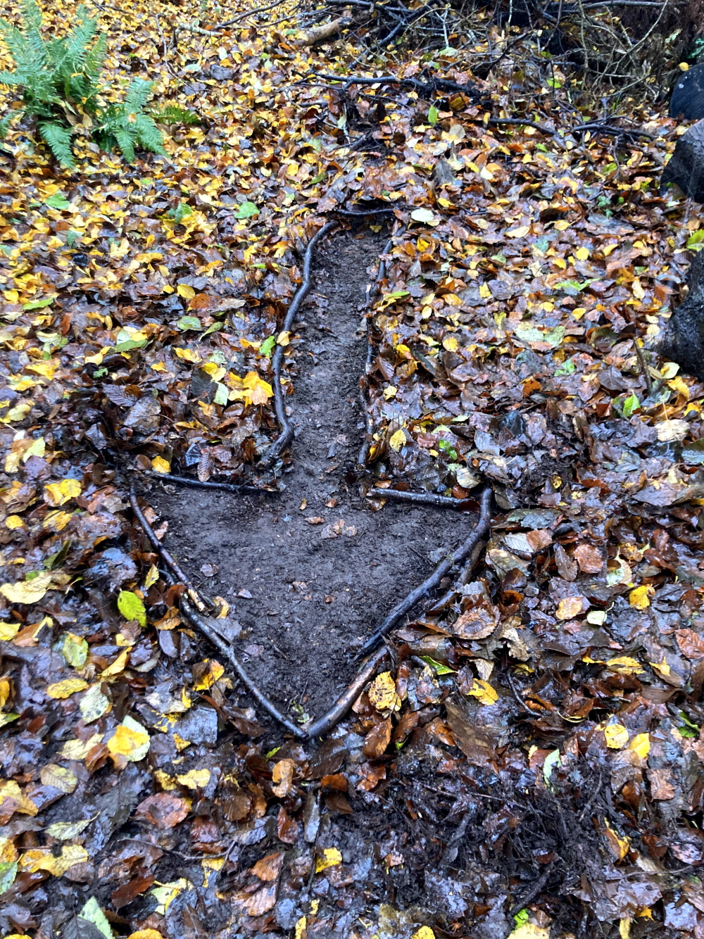 K: I entered the golf course, which is always deserted at this time of year and has some very wild, tucked-away areas. A fallen branch from a tree had been cut up, and I arranged some pieces into a pattern. I had had an idea to weave twigs or long grasses through a fence that runs along the golf course, and ventured into an area that I thought would be undisturbed. It was very wet and dirty, and I was not sure if the fence actually went through, so I walked back towards the golf course where I had thought instead to make a shape in the thick covering of wet leaves on the ground. I drew an arrow—a point of exit or escape—using our theme of freedom and constraint. I liked how it looked so I cleared the ground more and found twigs to line the arrow to give it more definition. This was challenging, given the rain, cold hands, and wet earth.