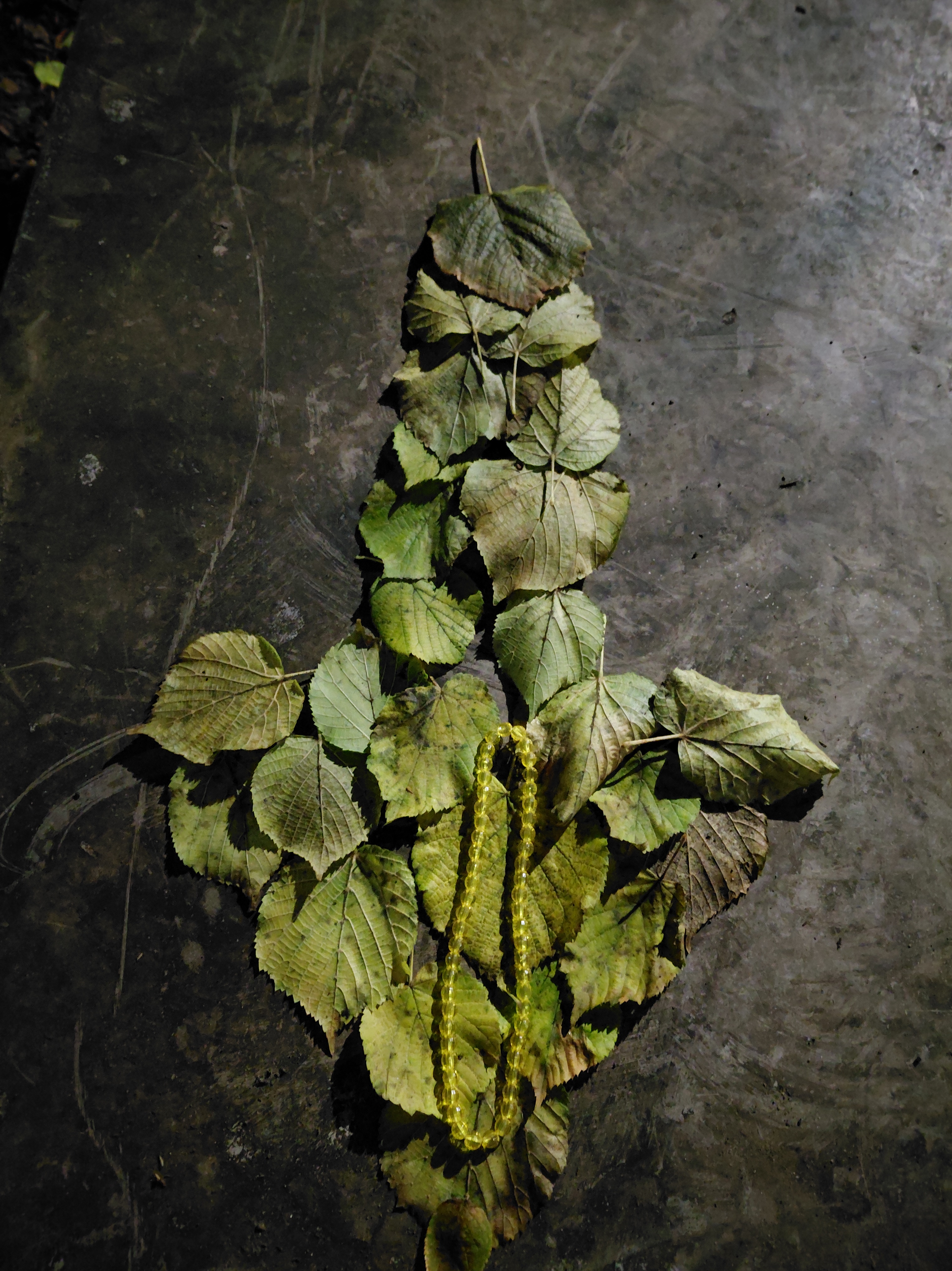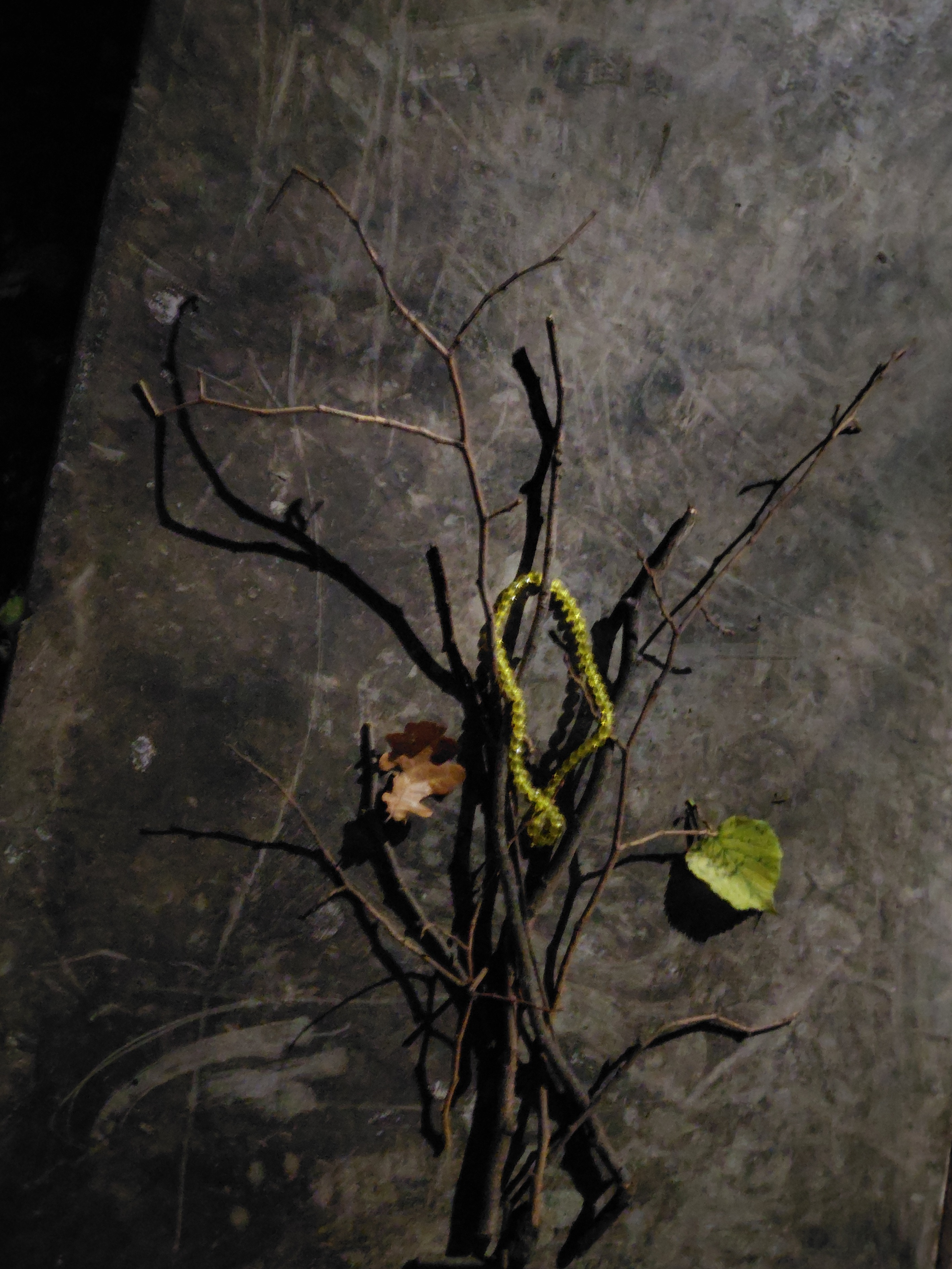 Collecting items which drew my attention, I arranged them on a shiny and durable surface that was part of a new skateboarding ramp. Collectively they spoke of my walk, our collaboration, themes, and the place itself. I was careful not to break anything, but juxtaposed them in a different way, forming a bouquet of natural branches and leaves and adding a necklace I had found earlier. My work was lit by street lamps which allowed the bauble to glitter. The background reflected in the same way that slices of the moon were being reflected in the water.