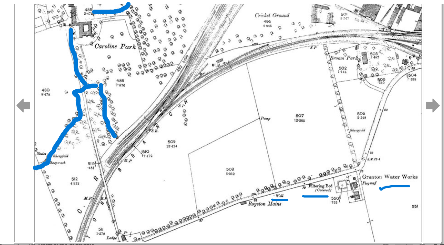 1896 Granton map (annotated to show the Granton Burn and nearby wells and springs)