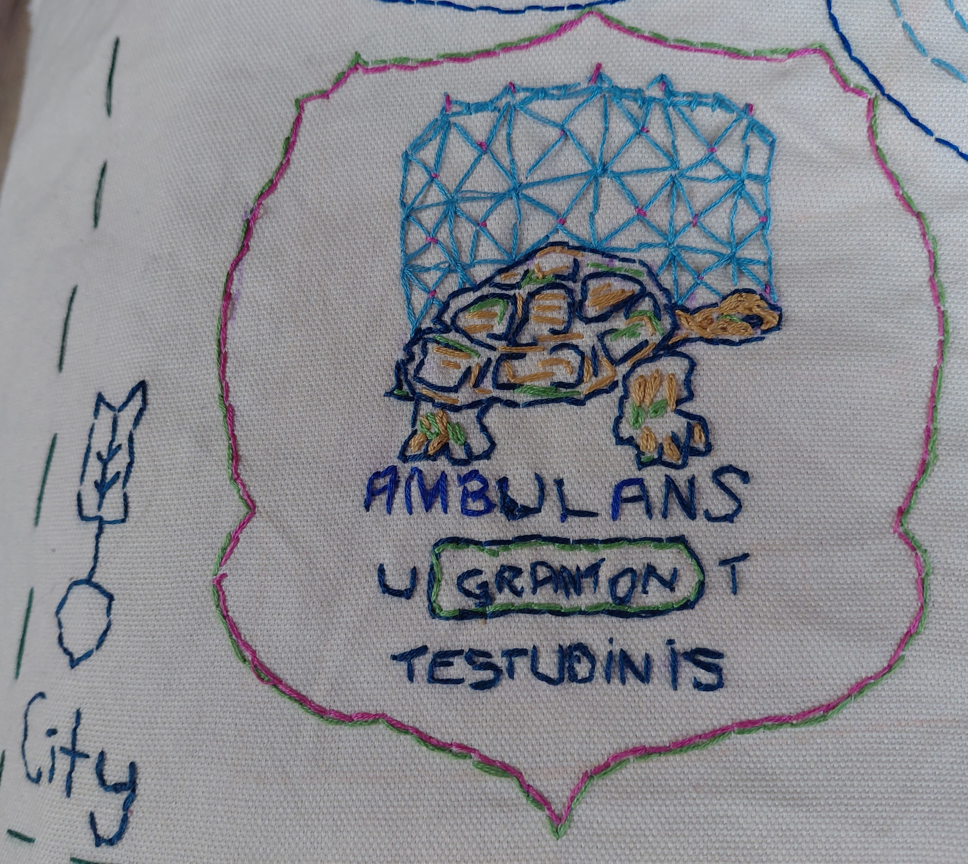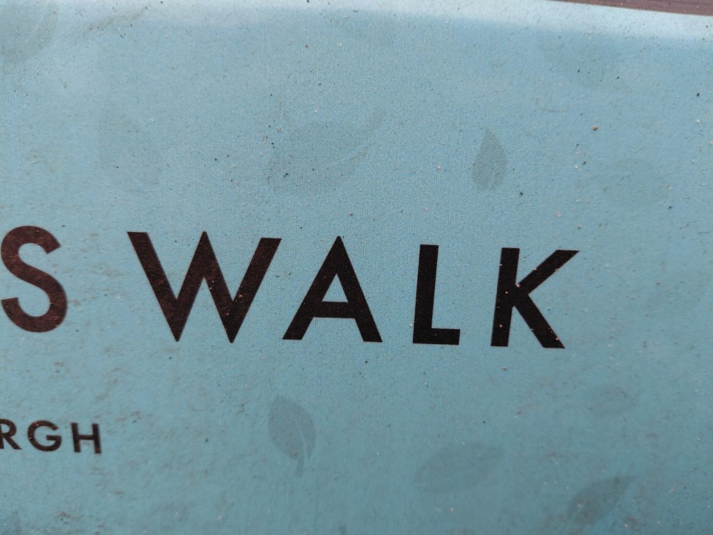 The map shows the Granton Burn rising at Corstorphine Hill near the Scott Tower, flowing under rocks (famous for their cups), woodland (oak, birch, ash and here, Scots Pine), and grassy hillside and flatter land (where someone walks, reminiscent of the figure in the VIII Cups tarot card designed by Pamela Colman Smith). There are buildings which relied on water – amongst others, a mill, the sphinx from Madelvic House (home of United Wire and the Electric Car Company), Mushet’s iron works, the Northern Lighthouse Board building (1860s), and the iconic Granton gastower (recently painted and decorated). The latter is also part of an imaginery Granton coat of arms which features the Granton Tortoise (story here) and the Latin script, ‘Ambulans ut Testudinis’ (Walking Like a Tortoise) referencing an earlier walking art project.