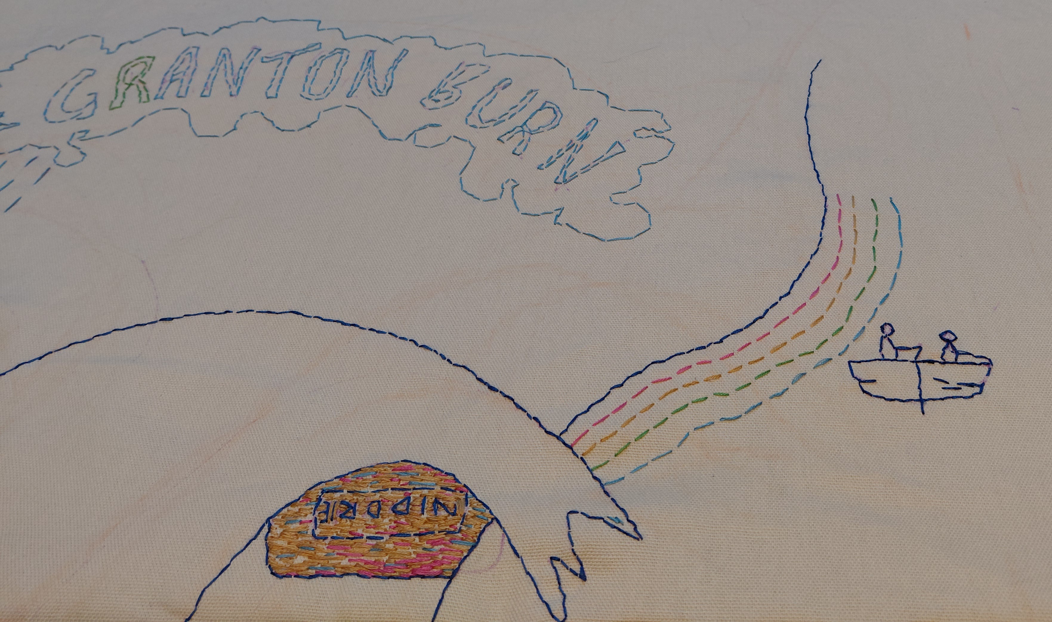 The map is embroidered in the colours found on the 1835 Bartholomew map and the 1867 Parish Johnston Plan, and the sea is stitched in different colours because, I have been told by many residents, it flowed sometimes pink, sometimes other hues according to which ink was being dumped in there by local company, A. B. Fleming.