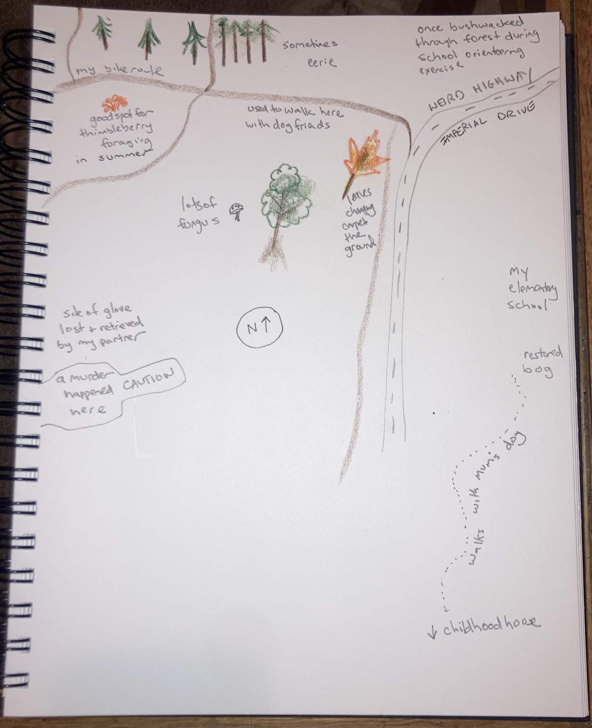 We walked at the same time as each other, Kristina in Canada and Tamsin in Scotland, agreeing that the location would be woods, and the subject, mapping. Stopping at 20, 40 and 60 minutes, we drew and/or recorded verbal maps on site and then followed up with artwork that included collage and video.