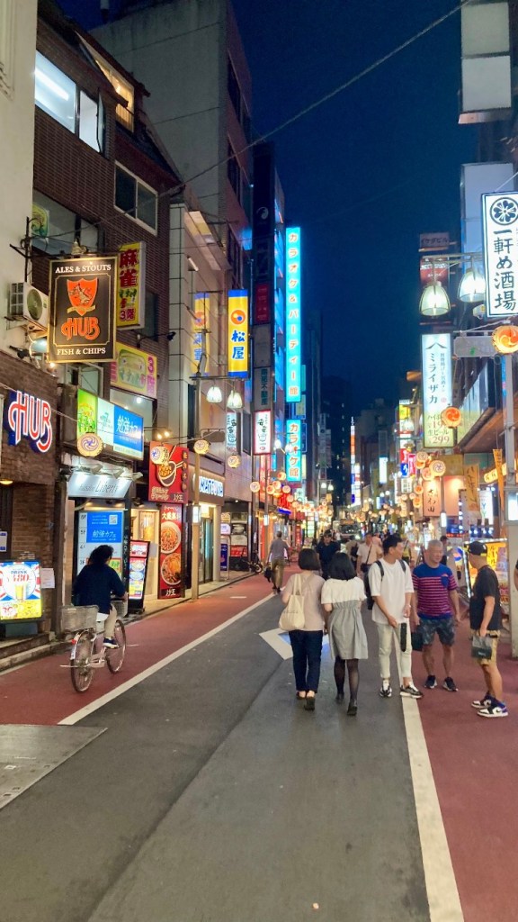 There were many young, excited visitors to the moon installation, taking selfies and buying snacks. I did not plan a route, but a general circuit. I walked along a greenway for 5-10 minutes, which is lit and moderately travelled. After that I headed into residential streets. In sharp contrast, almost all were completely deserted, even at this relatively early hour. Tokyo’s narrow residential streets discourage traffic, so I saw no cars and only a few pedestrians. I passed a few bikes and one cat. I heard many chirping insects as if in the countryside. I crossed several level crossings. Some streets continued in a long straight line, but most were on an irregular grid. After over half an hour weaving through these quiet backstreets, I emerged back to the bright streets of convenience stores, restaurants, apartment buildings, hair salons, and grocery stores.