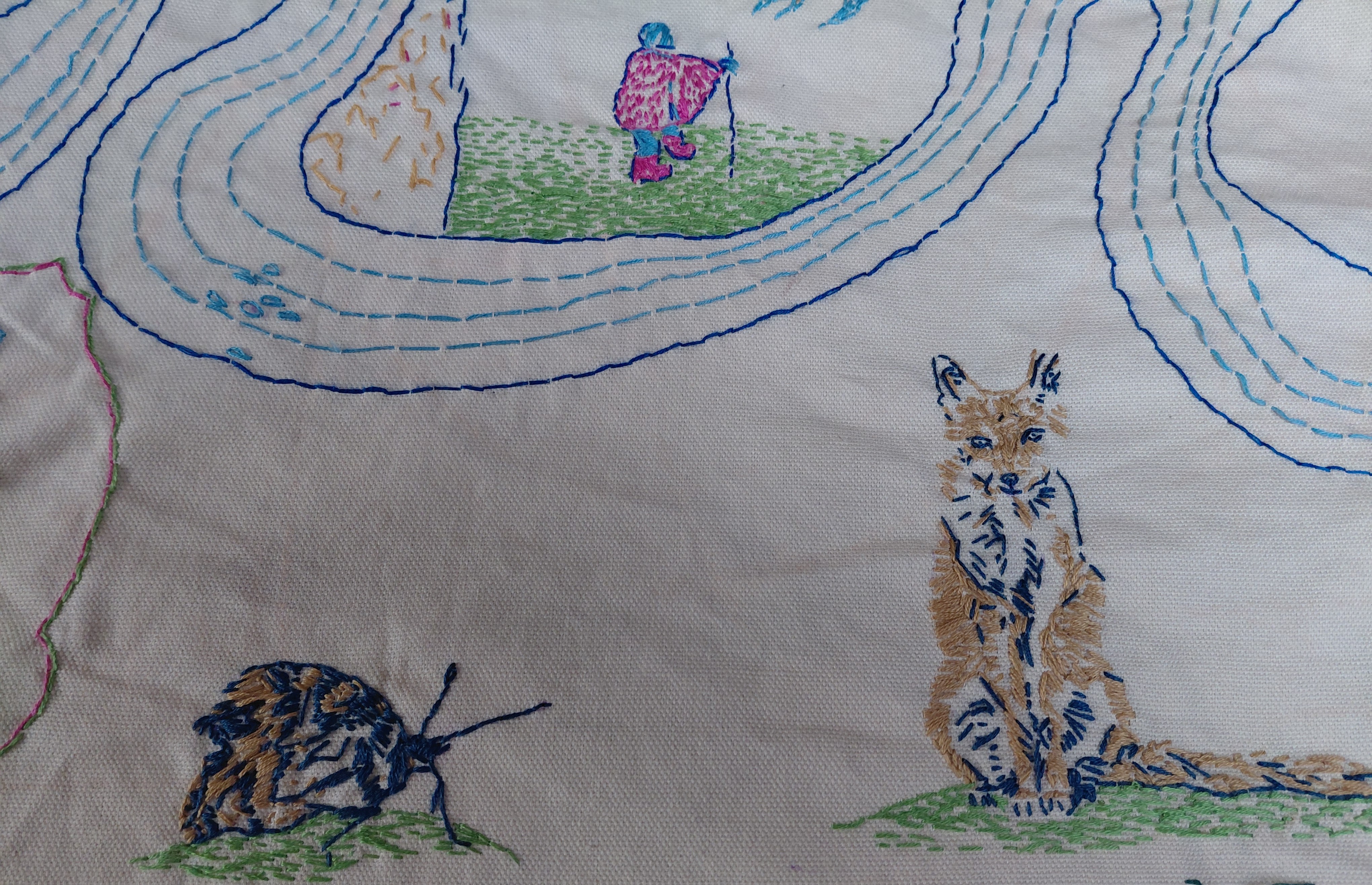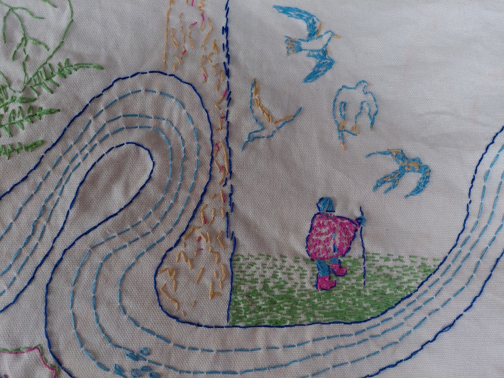 My footsteps drew the Burn above ground, and my stitches have made it manifest in fabric in the tradition of map makers of many sorts from the past. I’m thinking of the Sophia Mason 1802 map of England and Wales that’s in the Library of Congress in the US, the cross-stitched 1940s maps made by children, the Gough Map on vellum, or the circular TO Mapa Mundi. This is a way of stitching time, fixing one person’s view of a place on a specific date.