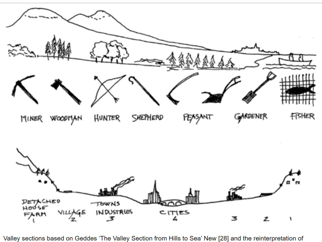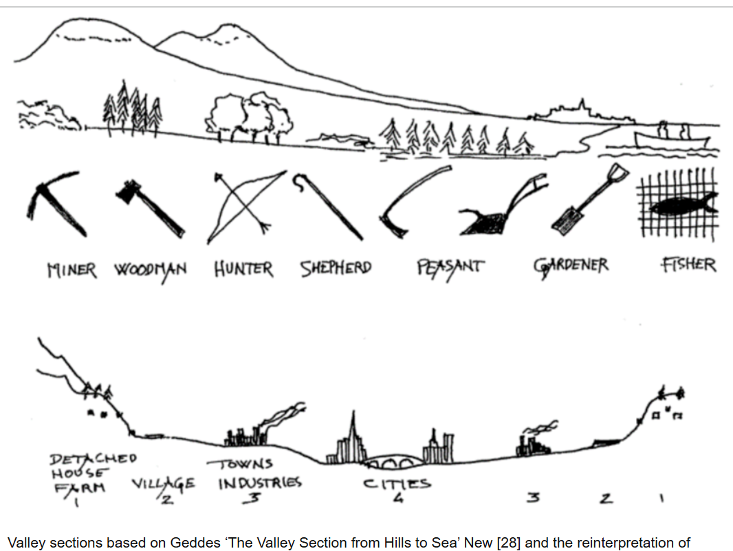 The small boat on the right of the map is similar to Geddes’ on his Valley Section (see below) with two people sitting in it, though I have given one of them a fishing rod (an age-old local industry) and the other a pilgrim’s staff with a gourd on top. The 11th century St Margaret ferry used to take pilgrims across to Fife from South Queensferry so that they could continue to walk to St Andrews. Other sea routes, and the Esparto Grass which covers the harbour, refer to the intercontinental trade which exported coal, bricks and so on, and imported goods and people, including grass for the mills along the River Almond and the Water of Leith.