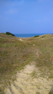 The day began with 25 minutes of fast walking from the youth hostel to the set-off place. (Note: If you want to do this too, and I highly recommend that you do, and if you are not just making a day-trip from home, you must book accommodation in advance (see below)). It was the track I would have taken last night had I not been distracted by the beach and tiredness, and consequently missed the markers. I rushed cross-country, through soft grass and pale powdery sand as the day heated up. As always, everyone was really helpful, and I made it just in time.