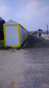 I take two minutes for a pee, drink of water, and view of Jullouville beach with its glorious view of huts and horses. A loud male voice interrupts my musings. Round the corner, it turns out to belong to someone trying to impress the girls.