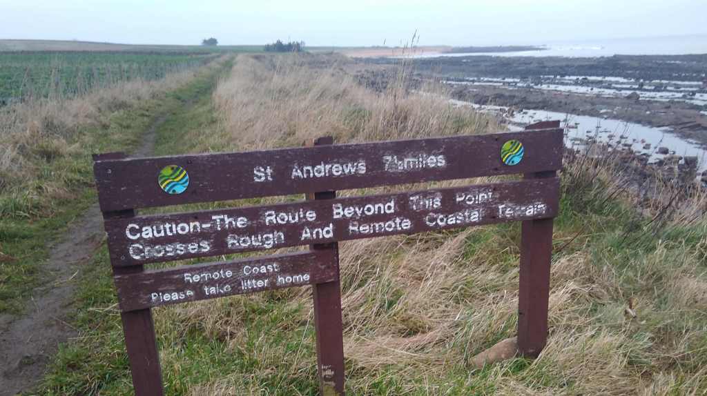 I was nervous of being stranded by the sea at night, so I took a left before I got to Cambo Ness. Although Kingsbarns village is covered up by a panel of writing on the Coastal Path map for stage 5, I had researched in advance and knew I could get a bus from there. I found my way across the corner of the golf course and up the beginnings of a small road where I spied a lit window where a woman was washing up. She kindly came to the door and advised me it would be quicker to stay by the sea. However, she is familiar with the area and I was not, so I took off up the farm track, through the yard, and narrowly missed the bus by about 3 minutes as it thundered past on the main A917. Then I had to do what she said I would and walk at the side of a very busy road, initially with no pavement, and into Kingsbarns by the church where I waited nearly half an hour for the 95 bus.