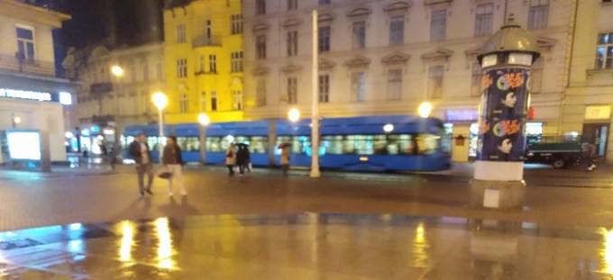 And they might look like basic plastic red and yellow seats but they are heated! Zagreb, Croatia.A blue tram whizzes through the main square in the rain one evening. Zagreb, Croatia.