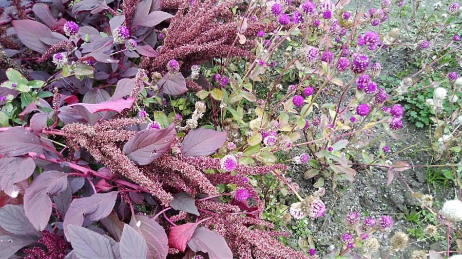 Orange fruits of Autumn.Textures of pink and bugundy. Amaranthus cruentus.Vibrant. Gomphrena globosa Rubra.