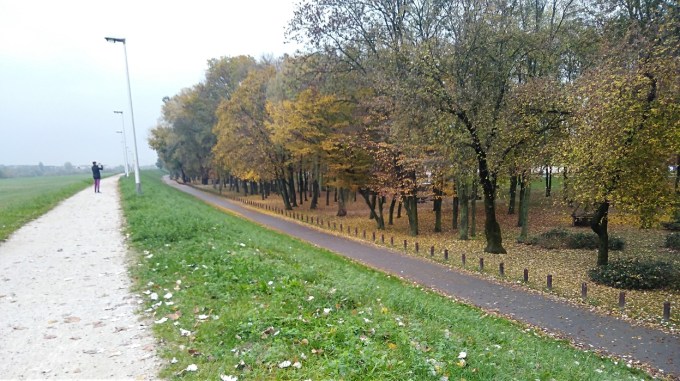 There are white paths stretching in both directions beside the Sava River. Between them and the banks there are expanses of grass which I guess are often deluged because there are mud covered plants there.