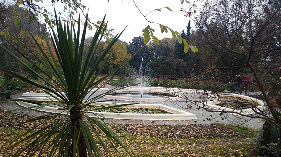 The first sight of the Botanic Gardens from the underpass – a red pagoda similar to the one in Edinburgh.Botanic Gardens, Zagreb – palm and fountains.