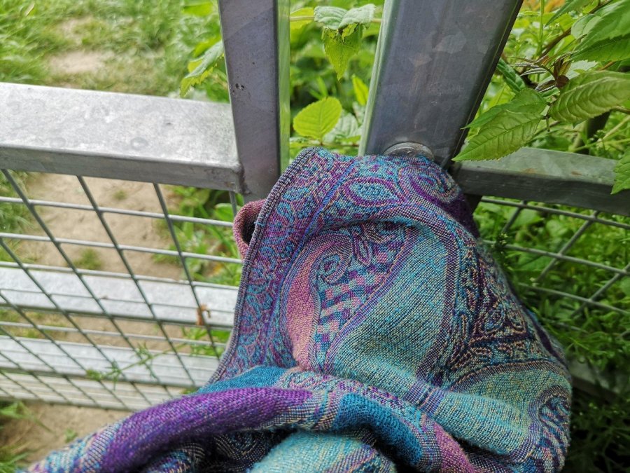 Uing the soft fabric of my scarf to open the metal gate to avoid cross-contamination from ‘the virus’- there was no other way to open it